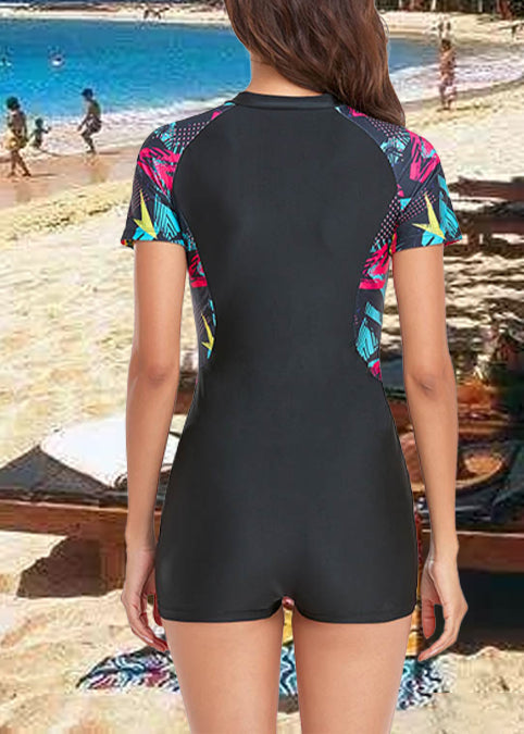 Funktionaler Chic: Der frontale Reißverschluss ermöglicht ein leichtes An- und Ausziehen, während die kurzen Ärmel und der bequeme Schnitt der Badebekleidung einen modernen Look bieten und zugleich Schutz vor der Sonne bieten.