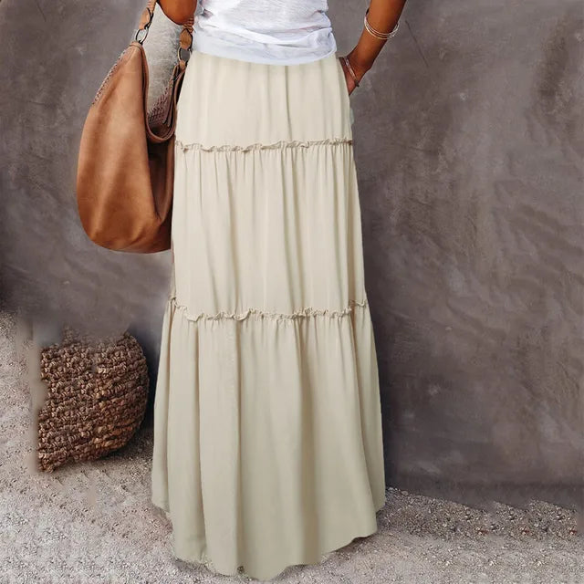 Genießen Sie leichten Sommerflair mit unserem „Helena“ Maxirock in Beige. Dieser Rock verspricht durch sein luftiges Design und die sanfte Farbgebung einen stilvollen und bequemen Sommer. Die gestuften Rüschen verleihen eine spielerische Note und fließen schön mit jeder Bewegung.