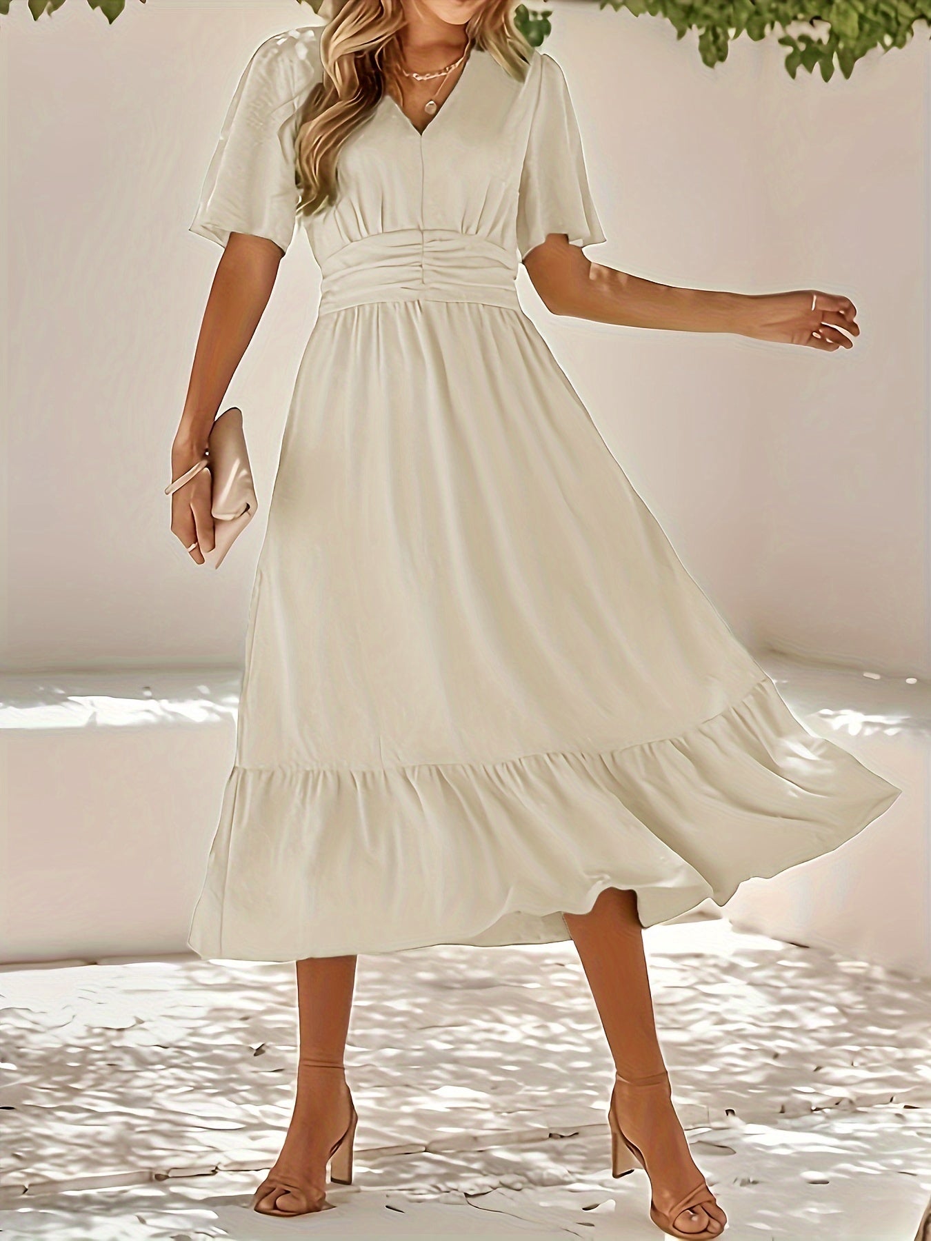 Zeitloses Design: Der V-Ausschnitt und die feinen Rüschen verleihen dem Kleid eine elegante und feminine Note. Die geraffte Taille betont Ihre Figur und sorgt für eine schmeichelhafte Silhouette.
