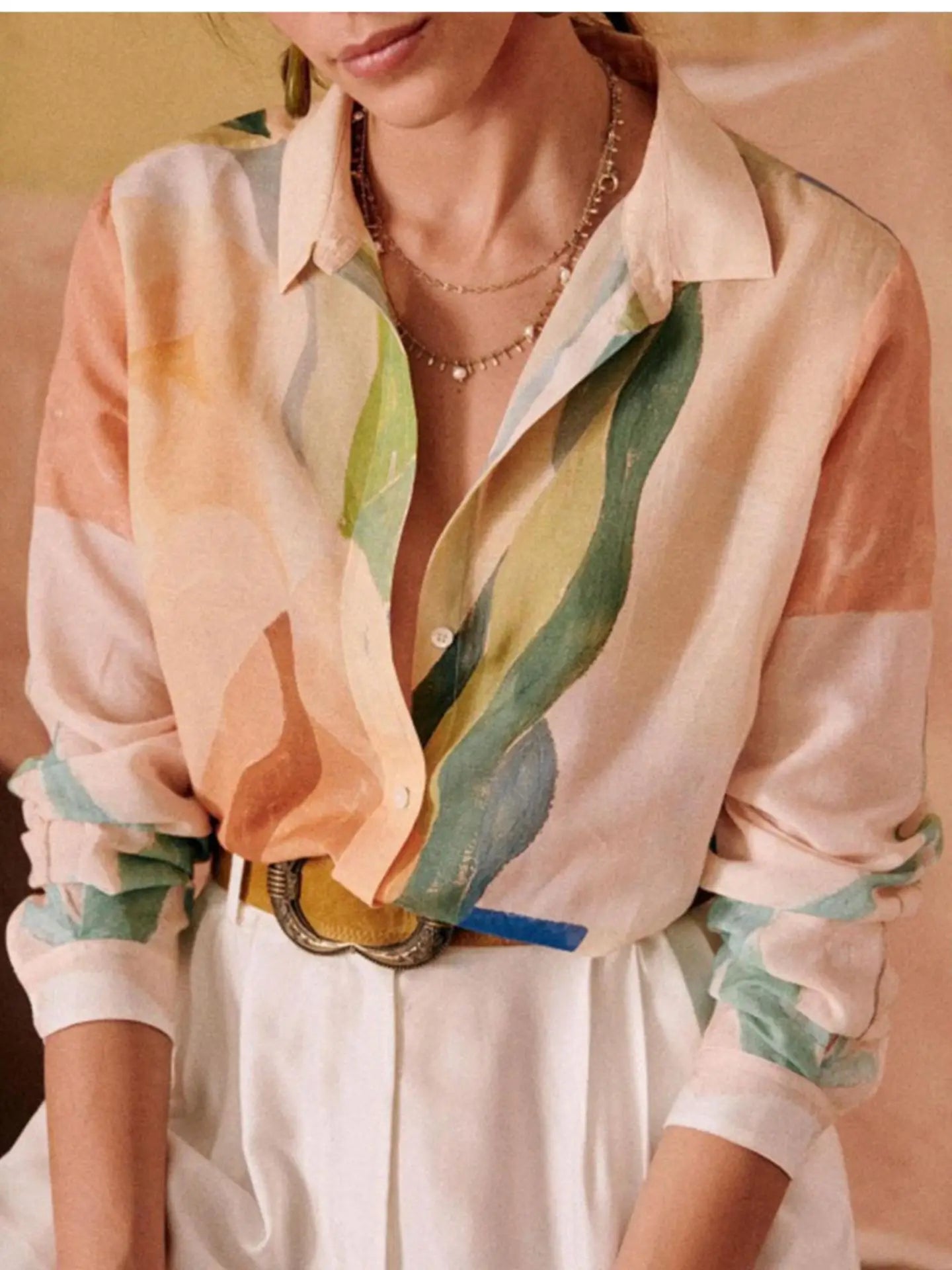 Hochwertiger Stoff und ein lebendiges Design machen dieses Hemd besonders. Die bunten, abstrakten Muster verleihen jedem Outfit einen künstlerischen Touch, während der leichte, atmungsaktive Stoff für ein angenehmes Tragegefühl sorgt. Der klassische Schnitt mit Knopfleiste und Kragen rundet den Look ab und bietet eine zeitlose Silhouette.
