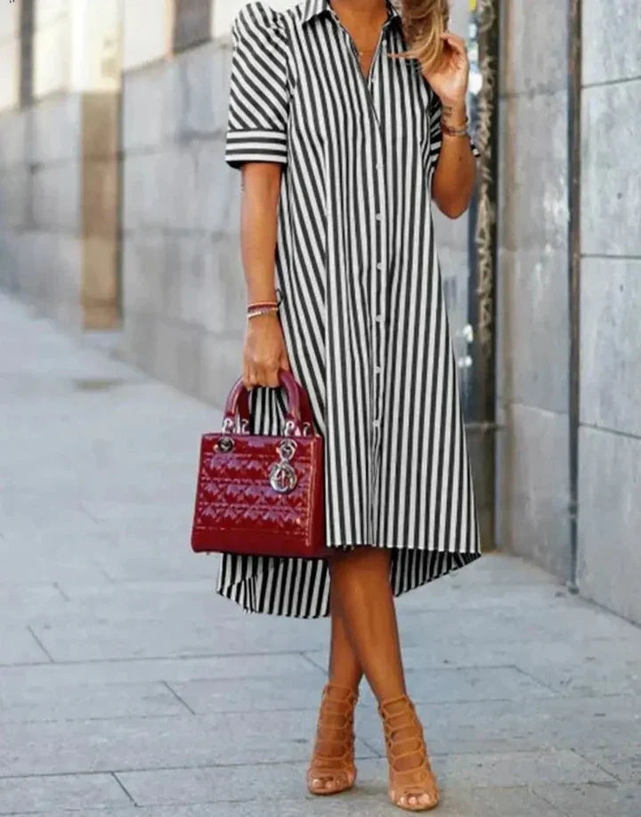 Das Clara gestreiftes Hemdkleid in Schwarz-Weiß ist die perfekte Wahl für einen modernen und eleganten Look. Dieses Kleid besticht durch sein klassisches Streifendesign und den Hemdkleid-Schnitt, die eine stilvolle und zeitlose Silhouette zaubern. Ideal für verschiedene Anlässe, kombiniert das Clara-Kleid schlichte Eleganz mit modischem Flair.