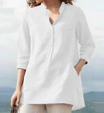 Das Claudia - einfarbige, lässige Top aus Leinen-Baumwolle mit Stehkragen ist perfekt für Frühling und Herbst. Es bietet eine bequeme Passform und zeitlosen Stil, ideal für den Alltag und vielseitig kombinierbar.