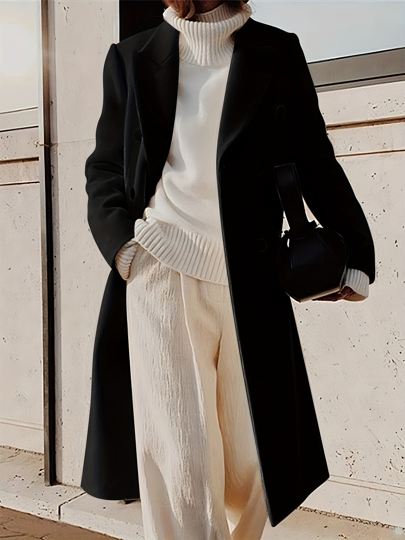 Dieser lange Mantel im zweireihigen Design verleiht jedem Outfit einen Hauch von Raffinesse. Der klassische Reverskragen und die elegante Schnittführung machen ihn zu einem vielseitigen Begleiter für formelle Anlässe und stilvolle Freizeitlooks.