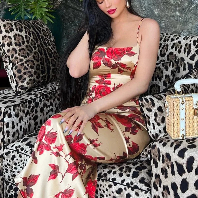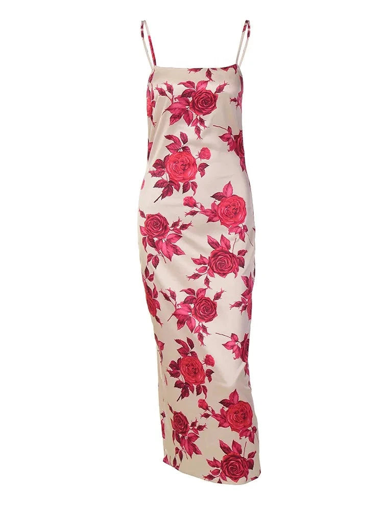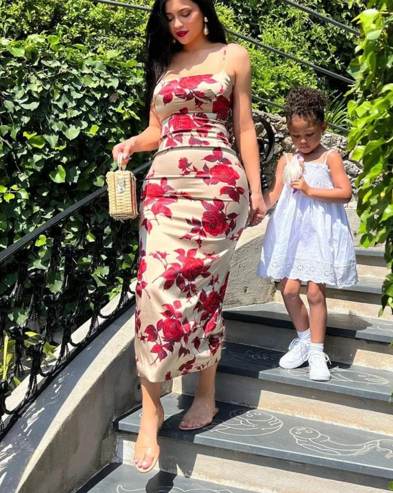 Ein Hauch von Nostalgie und Moderne. Das lebendige Rosenmuster auf cremefarbenem Grund macht dieses Kleid zu einem wahren Blickfang. Egal, ob Sie auf einer Hochzeit tanzen oder einen Spaziergang bei Sonnenuntergang machen, dieses Kleid ist ein stilvoller Begleiter.