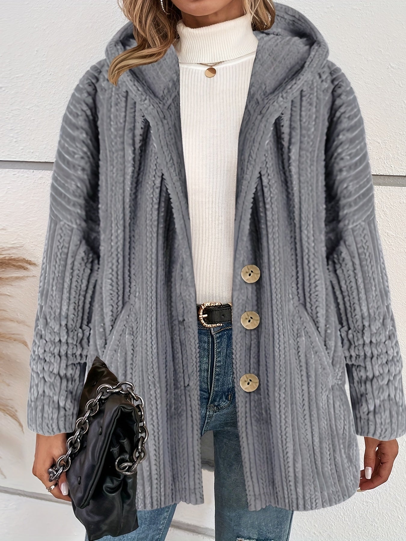 Der graue Kapuzenmantel mit Knöpfen - Lara ist die perfekte Kombination aus Stil und Funktionalität für die kalten Tage. Dieser lässige Mantel mit langen Ärmeln bietet Wärme und Komfort, während das schlichte Design und die praktischen Details wie die Knopfleiste und die Kapuze für einen entspannten, aber dennoch eleganten Look sorgen. Perfekt für den Alltag, ob in der Stadt oder bei einem Spaziergang im Freien.