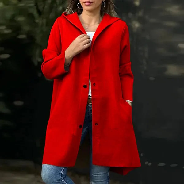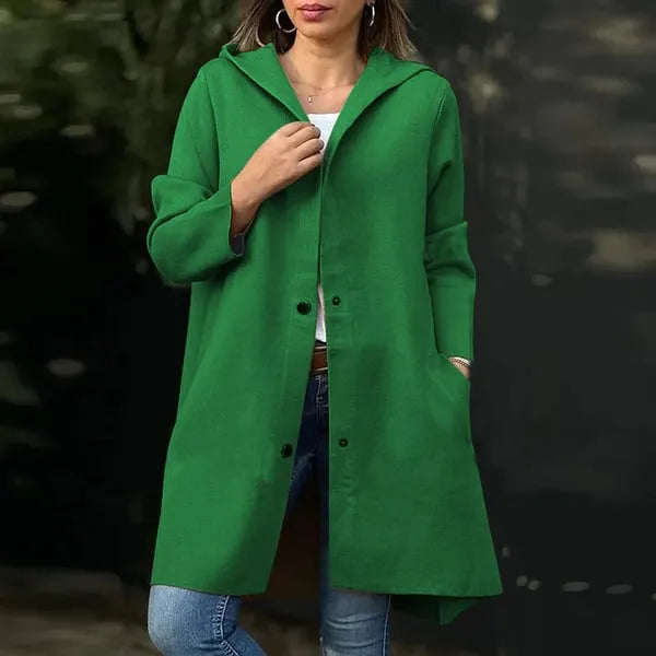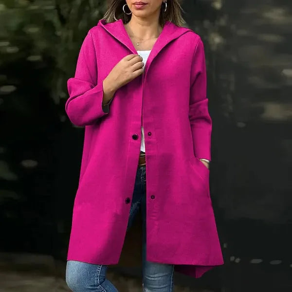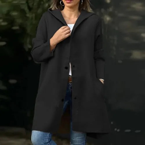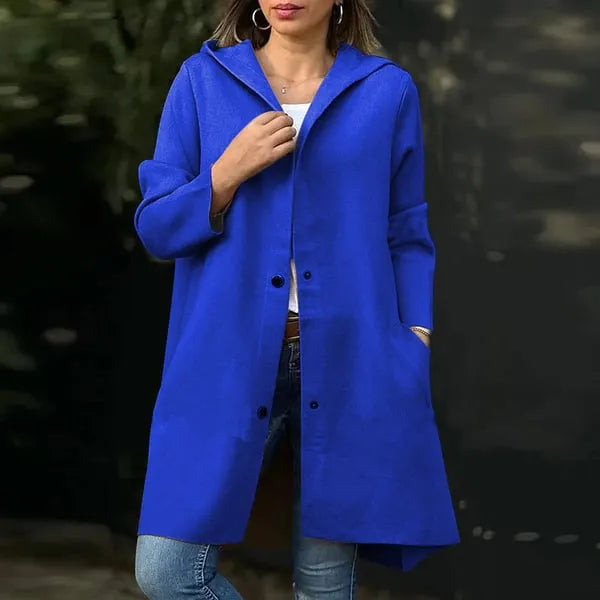 Mit seiner eleganten Ein-Knopf-Leiste und der schützenden Kapuze verbindet dieser Mantel Stil und Funktionalität. Er eignet sich ideal für den Alltag, besondere Anlässe oder entspannte Spaziergänge in der Stadt.