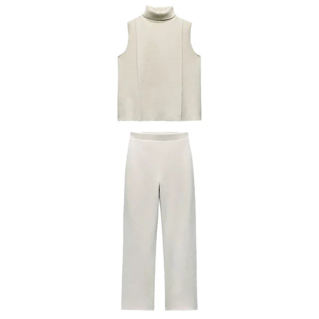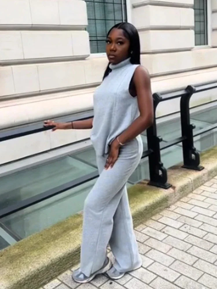 Schick und lässig zugleich: Das graue Strick-Zweiteiler-Set - Clara vereint zeitlosen Stil und mühelosen Komfort. Der elegante Rollkragen und die weite, fließende Hose sorgen für einen modernen Look, der sowohl für gemütliche Tage zu Hause als auch für Besorgungen in der Stadt geeignet ist.