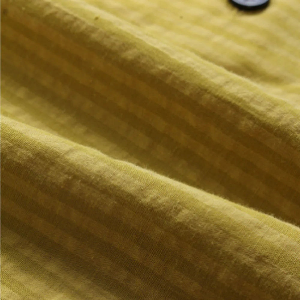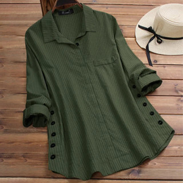 Natürlicher Chic für jeden Tag: Die Greta - Olivgrüne Leinen-Baumwollbluse ist ein Must-have für die stilbewusste Frau. Ihr klassisches Design wird durch moderne Elemente wie die seitlichen Knöpfe neu interpretiert.