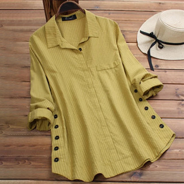 Perfekt für den Lagenlook: Ob offen über einem T-Shirt oder zugeknöpft für einen formellen Anlass, diese Bluse ist so vielseitig wie Ihr Leben. Die tiefen Seitenschlitze und Knöpfe fügen einen trendigen Akzent hinzu.
