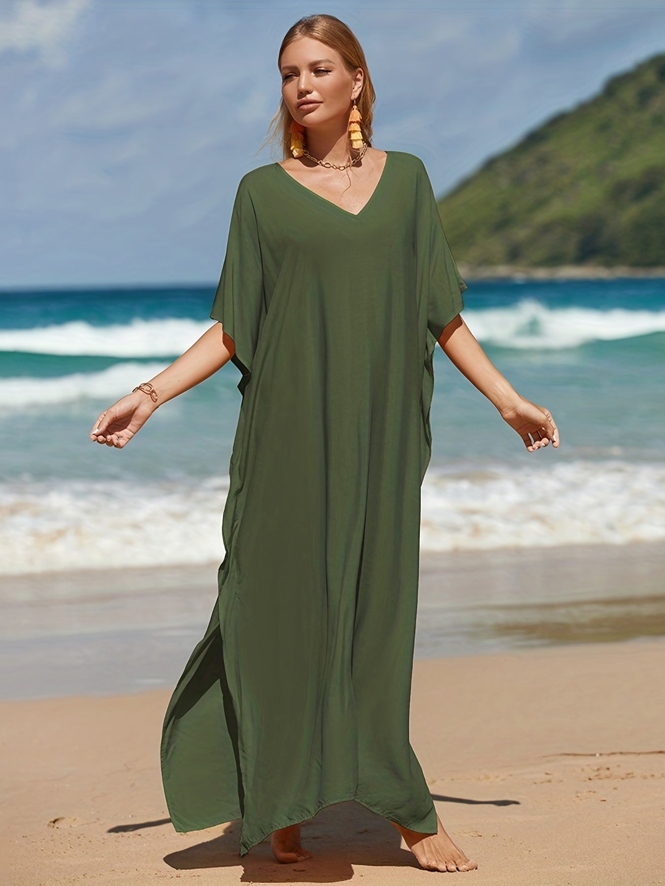 Elegantes Design: Das grüne Kleid besticht durch sein fließendes Design und den tiefen V-Ausschnitt, der Ihnen eine feminine Silhouette verleiht.