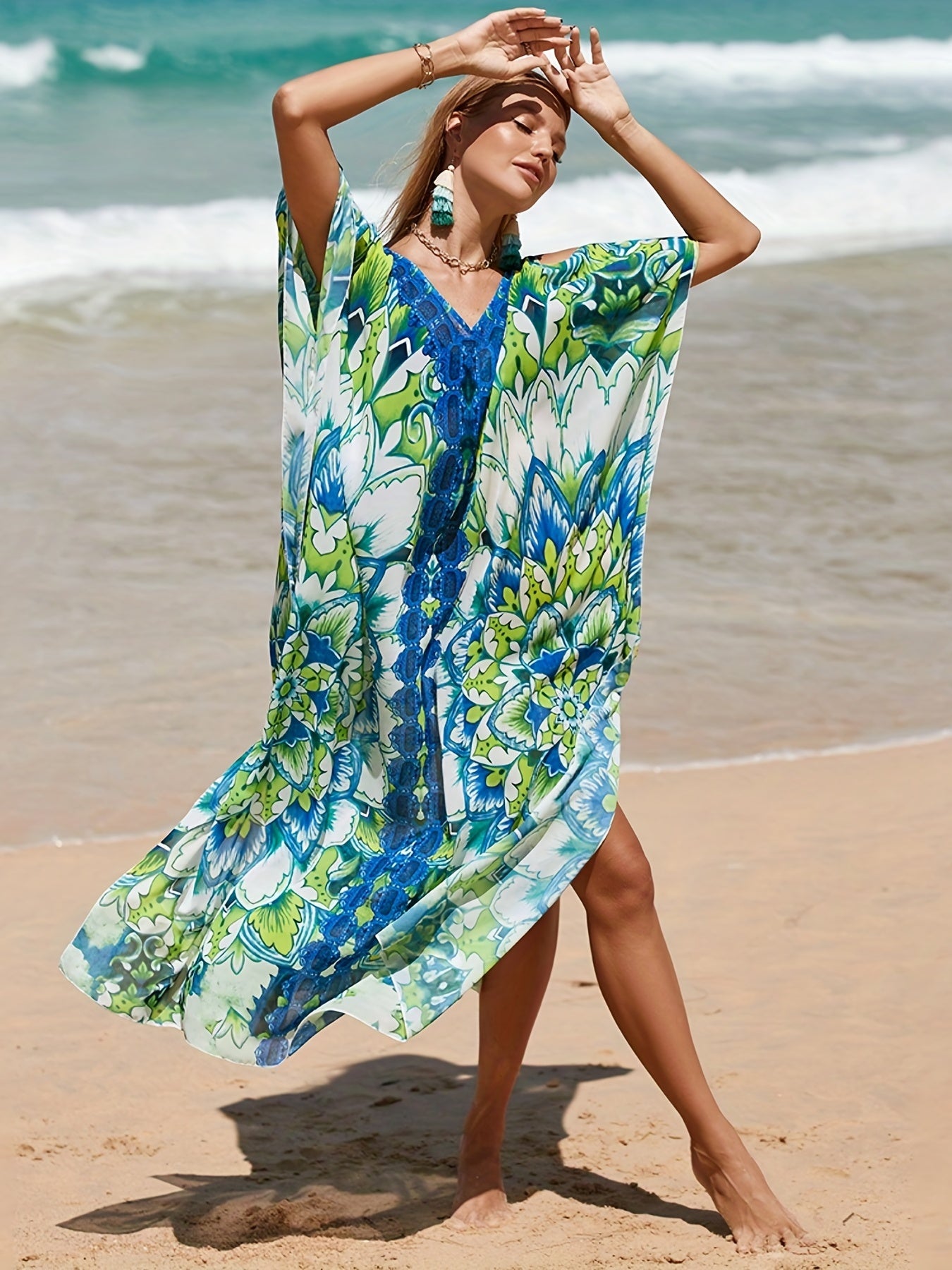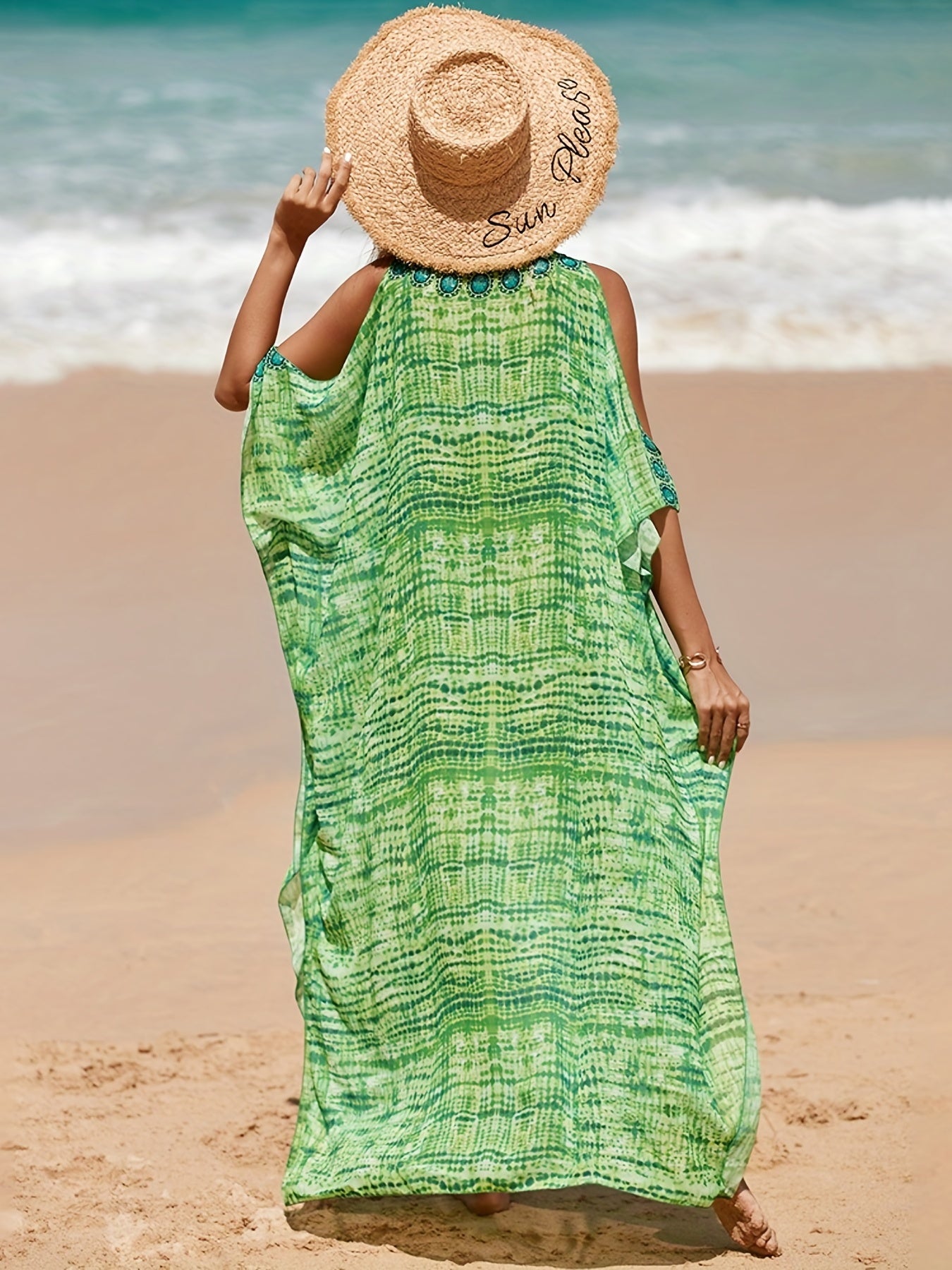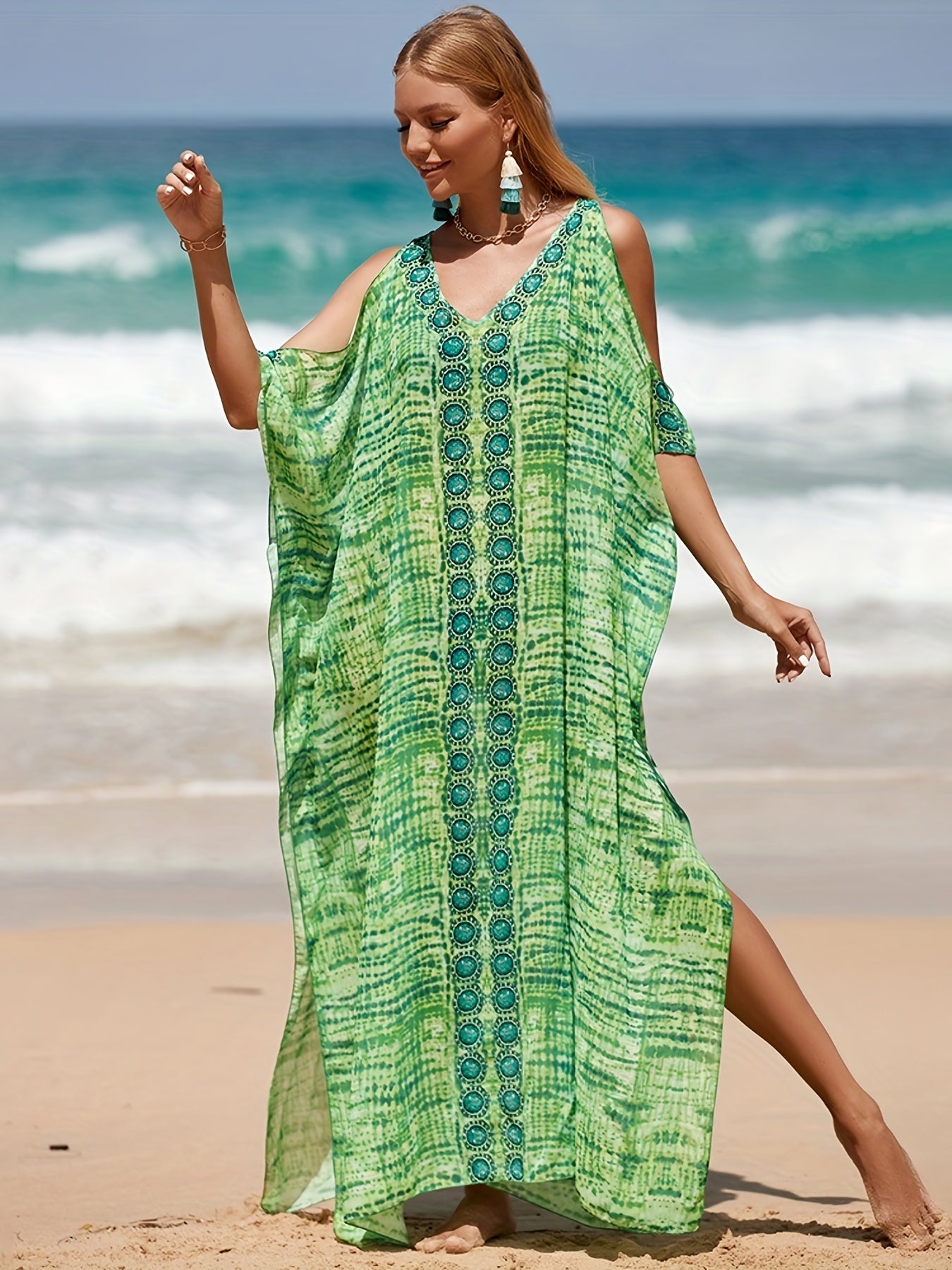 Boho-inspiriertes Design: Das grüne Kleid besticht durch sein lebendiges, gemustertes Design, das Ihre Garderobe mühelos aufwertet. Der lockere Schnitt und die offenen Schultern sorgen für ein luftiges und bequemes Tragegefühl.