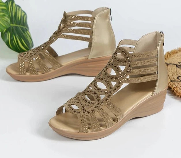 Durchbrochenes Design trifft Komfort: Die kunstvollen Ausschnitte bieten eine attraktive Optik und Belüftung, während der Keilabsatz für einen angenehmen Stand sorgt.