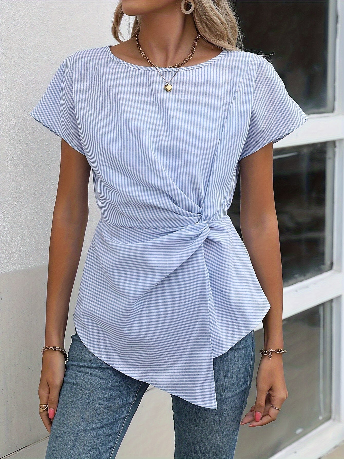 Erweitern Sie Ihre Garderobe mit unserer stilvollen hellblau-weiß gestreiften Wickelbluse. Diese elegante Bluse ist perfekt für Frauen, die nach einem bequemen und zugleich modischen Look suchen.
