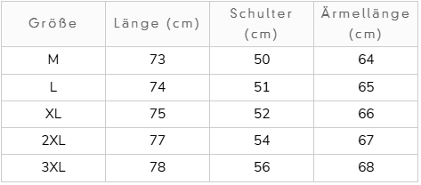 | Größe | Länge (cm) | Schulter (cm) | Ärmellänge (cm) |