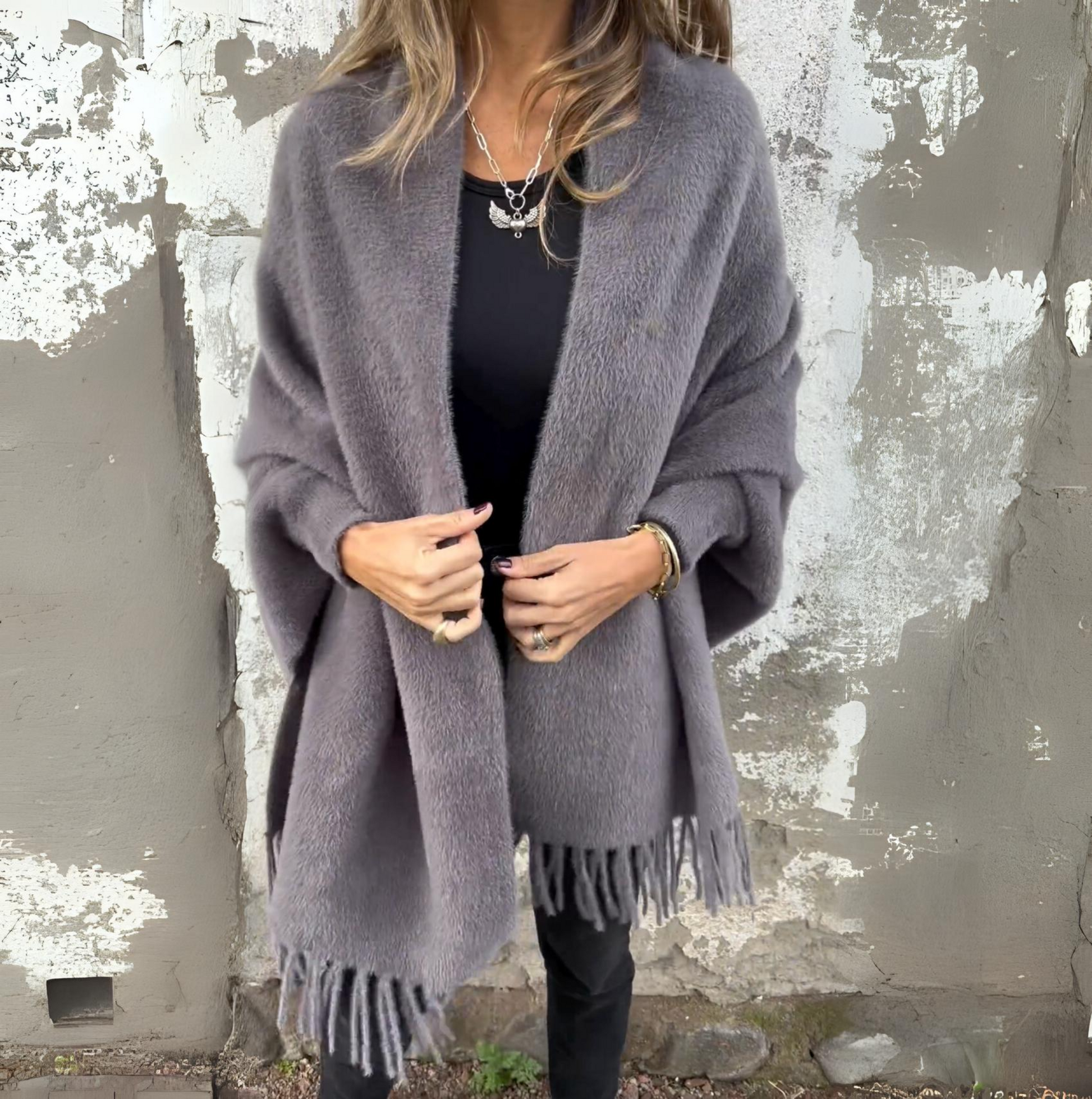 Verleihen Sie Ihrem Outfit mit diesem stilvollen Angora-Poncho eine luxuriöse Note!