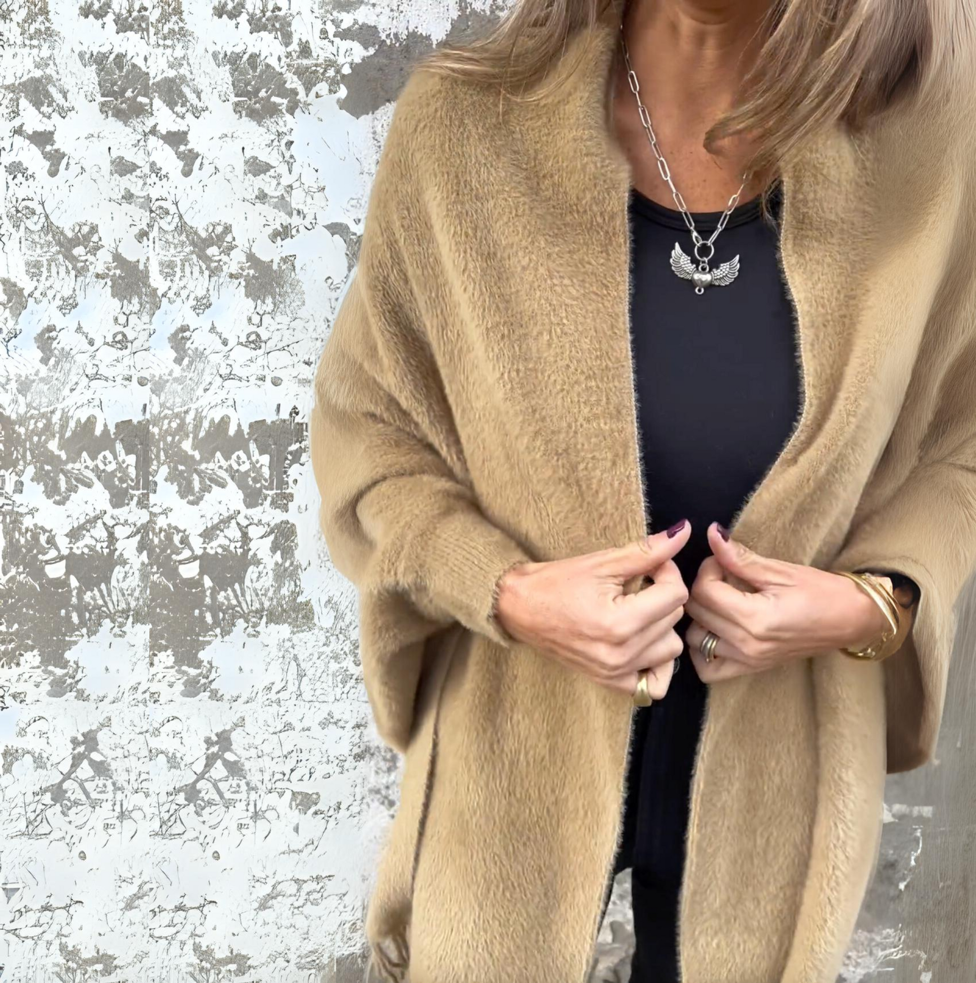 Dank des hochwertigen Angora-Materials hält der Poncho Sie angenehm warm, ohne zu beschweren. Der offene Schnitt sorgt für Bewegungsfreiheit und macht ihn ideal für den Lagen-Look.