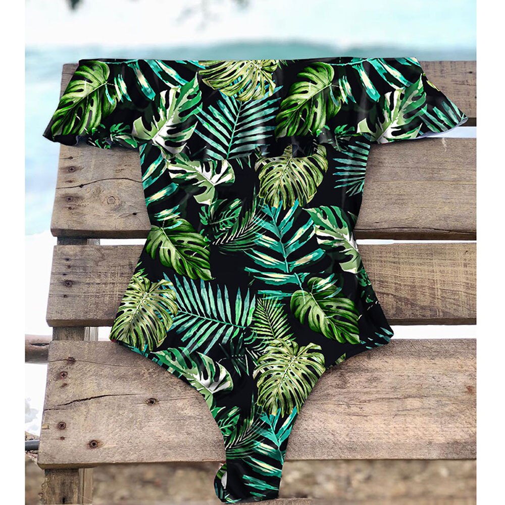 Erliegen Sie dem Charme von Lena, einem Badeanzug, der den Geist tropischer Fluchten einfängt. Dieser Einteiler mit seinem lebhaften grün-schwarzen Blumendruck und der eleganten Rüschenlage schenkt Ihnen ein Gefühl von Urlaubsglück und exotischer Schönheit, egal wo Sie sind.