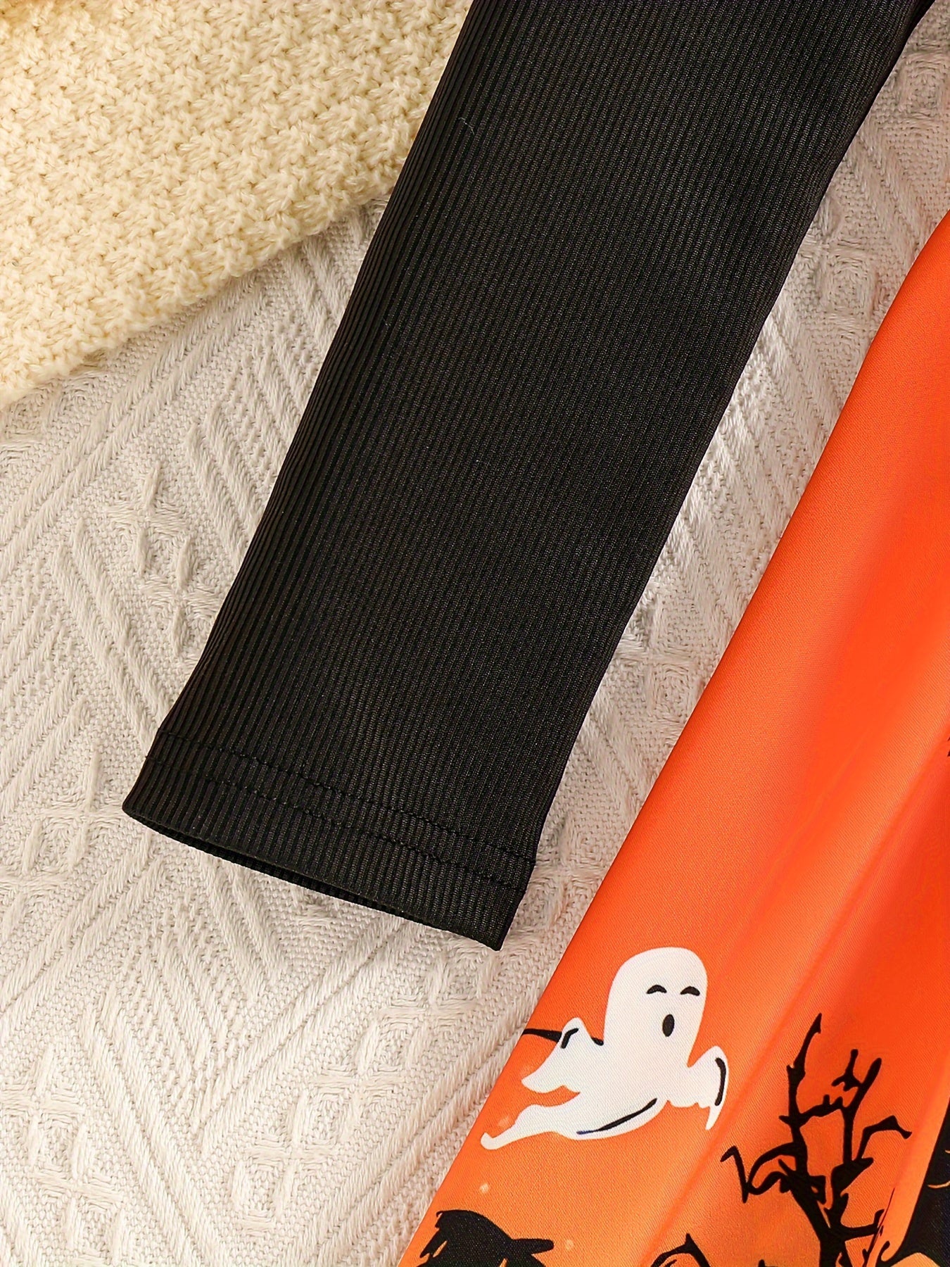 Festlicher Print: Die Kombination aus einem schwarzen Oberteil und einem farbenfrohen Rock mit Geisterhaus-Motiv sorgt für einen einzigartigen und stilvollen Look.