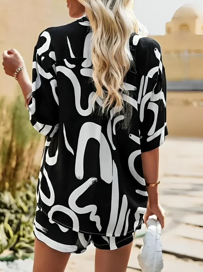 Setze ein modisches Statement- Dieses Ensemble verbindet kühne Muster mit lässigem Chic. Das dynamische Schwarz-Weiß Design zieht die Blicke auf sich, während der entspannte Schnitt Deine Silhouette schmeichelt.