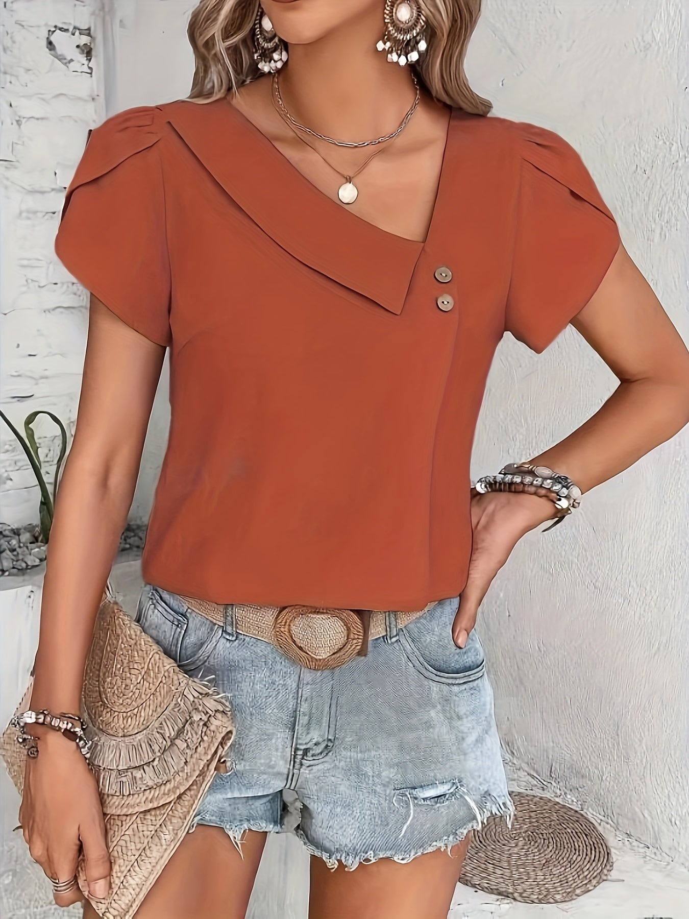 Eleganter V-Ausschnitt für feminine Note: Der asymmetrische V-Ausschnitt und die dekorativen Knöpfe verleihen diesem Top einen einzigartigen Charme, der jedes Outfit aufwertet. Ideal für sowohl formelle als auch informelle Anlässe.