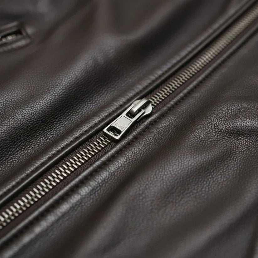Die schmal geschnittene Lederjacke Oskar mit Stehkragen und Reißverschluss vereint elegantes Design mit zeitloser Eleganz. Gefertigt aus hochwertigem Leder, bietet sie eine taillierte Silhouette und langanhaltenden Tragekomfort. Ob lässig oder formell – diese Jacke verleiht jedem Outfit mühelos Raffinesse.