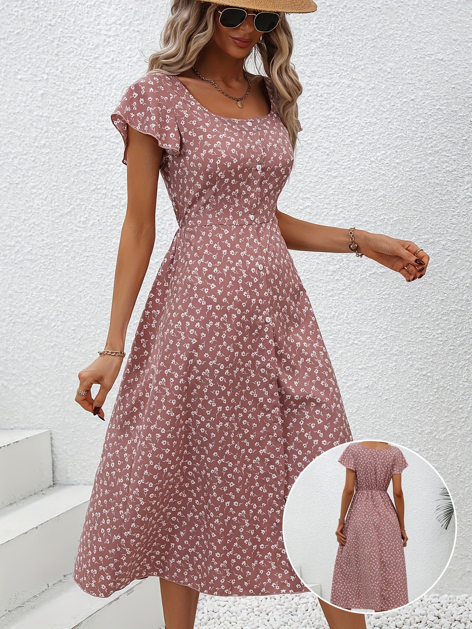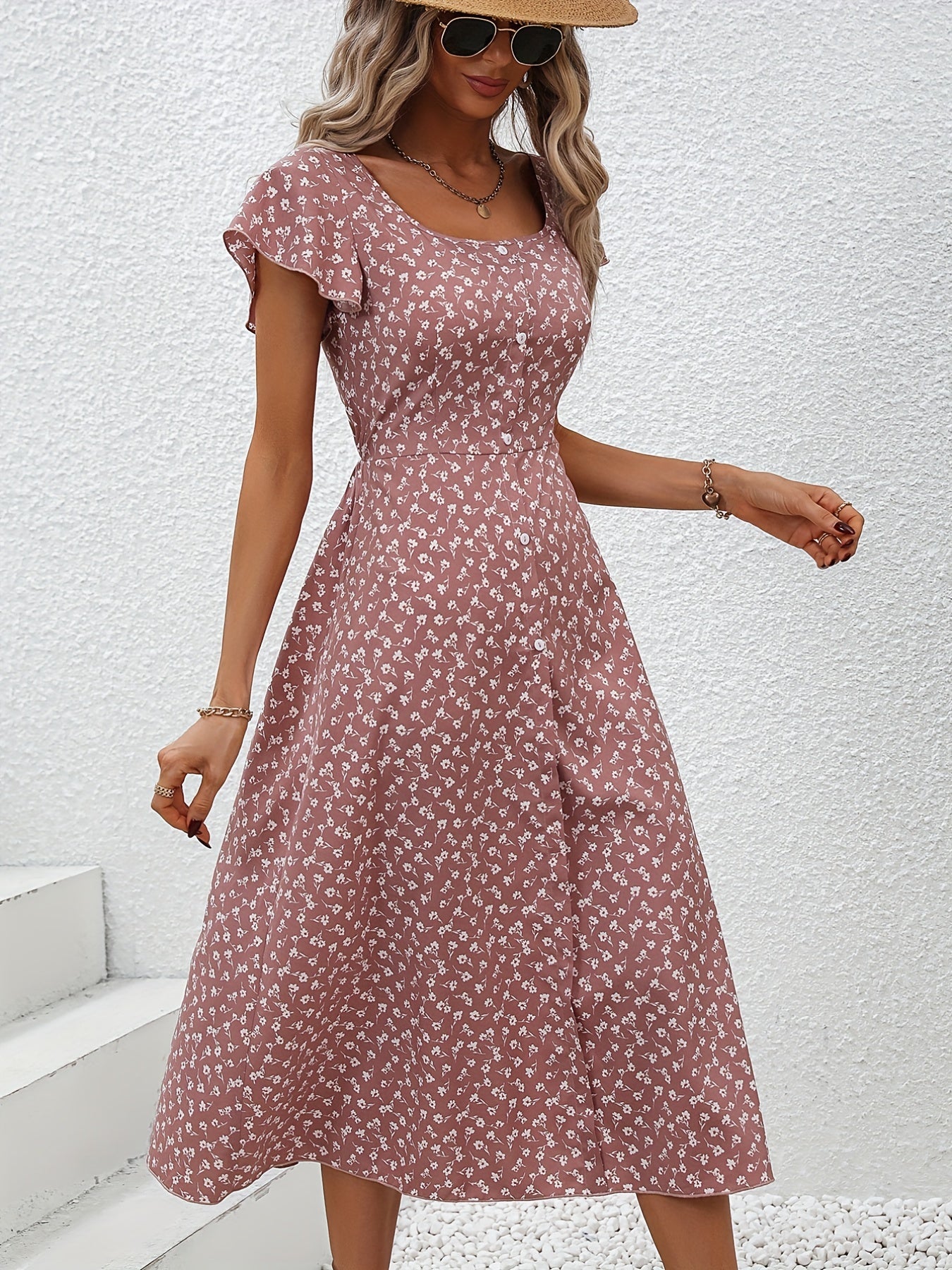 Mit dem rosa Blumenmuster Midikleid holen Sie sich den perfekten Mix aus Verspieltheit und Eleganz in Ihre Garderobe. Dieses Kleid ist ideal für entspannte Sommertage oder fröhliche Zusammenkünfte mit Freunden. Die zarten Blumenmuster und die charmanten Rüschenärmel verleihen Ihrem Outfit einen femininen und romantischen Touch, der Sie strahlen lässt.