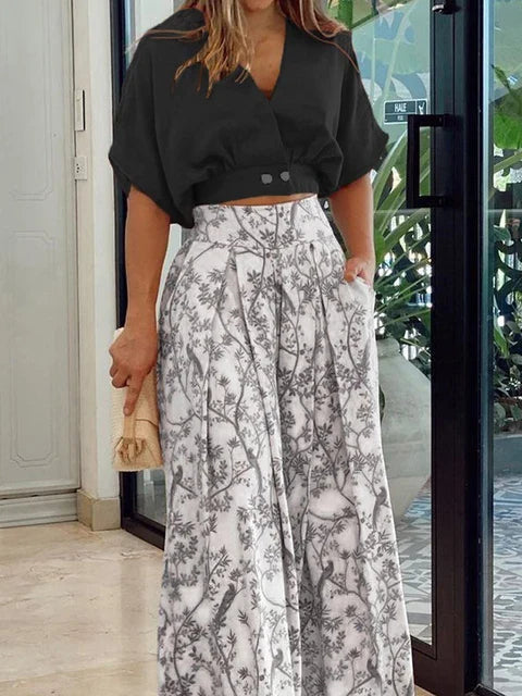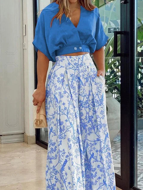 Genieße die lebhafte Eleganz dieses roten Blumen Sets. Das kurze, lockere Oberteil und die weit geschnittenen Hosen sind mit einem wunderschönen Blumenmuster verziert, das sofort Sommerlaune verbreitet. Ob bei einem Gartenfest oder einem Stadtbummel, dieses Set lässt dich immer strahlen.