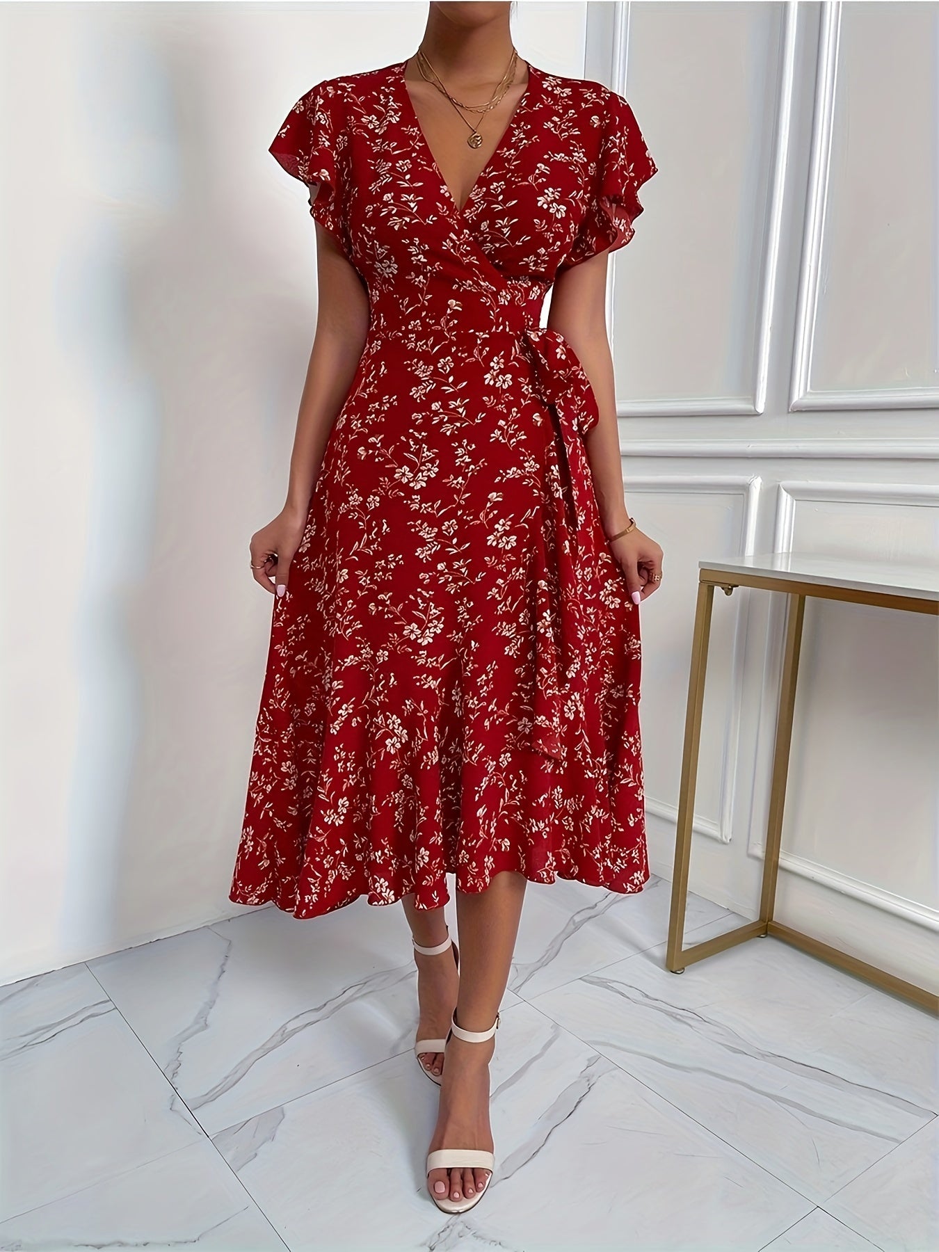 Verleihen Sie Ihrem Look eine elegante Note mit unserem roten Wickelkleid mit Blumenmuster. Dieses Kleid vereint femininen Stil und sommerliche Leichtigkeit, perfekt für besondere Anlässe und entspannte Tage. Die kräftige rote Farbe und das zarte Blumenmuster machen es zu einem Hingucker.
