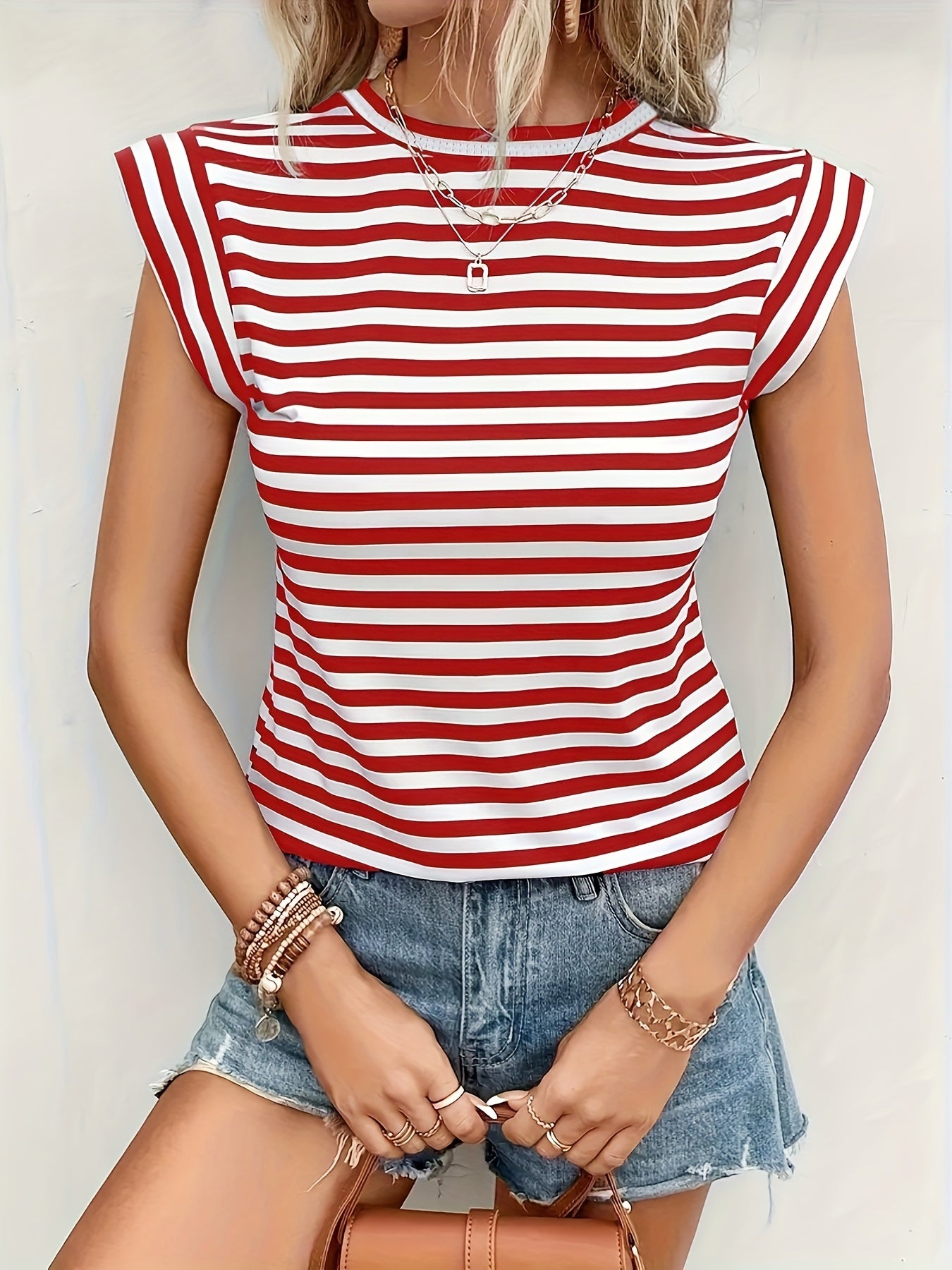 Tauche ein in den Charme der Scharlachroten Streifenbluse Verena. Diese Bluse mit ihren lebhaften scharlachroten und weißen Streifen bietet einen klassischen Look mit einem modernen Twist. Perfekt für den Sommer, bringt sie frische Farbe und Stil in jede Garderobe.