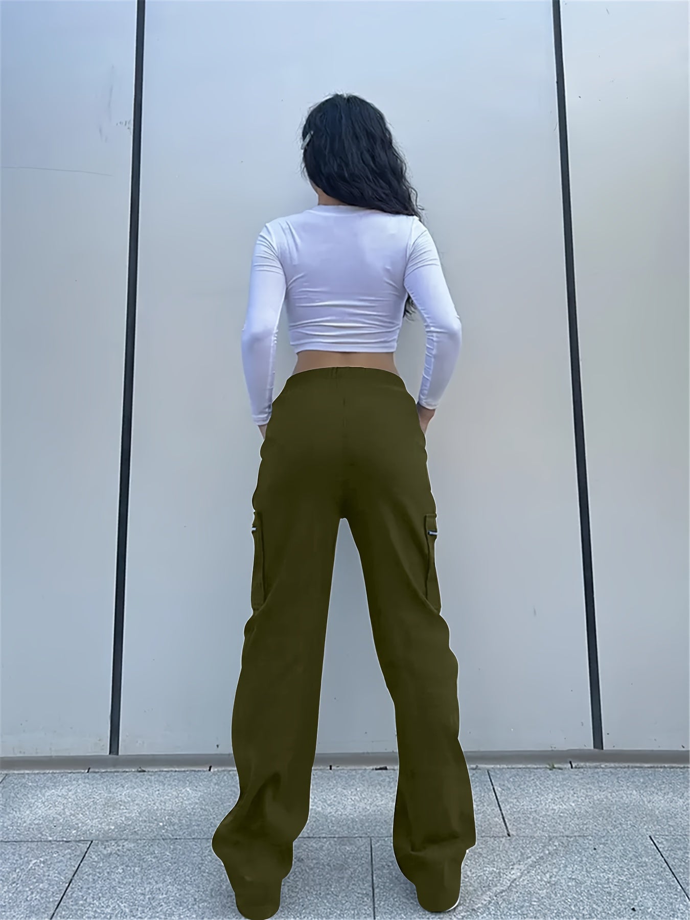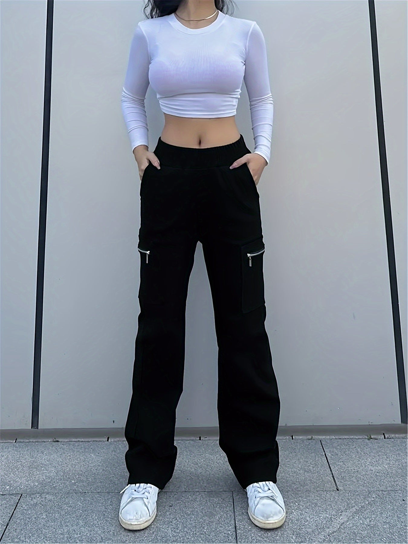 Bringen Sie funktionalen Stil in Ihre Garderobe mit der Schwarzen Cargo-Hose mit Reißverschlusstaschen - Mia. Diese Hose kombiniert Komfort mit praktischem Design und bietet eine lässige Passform, ideal für den Alltag.