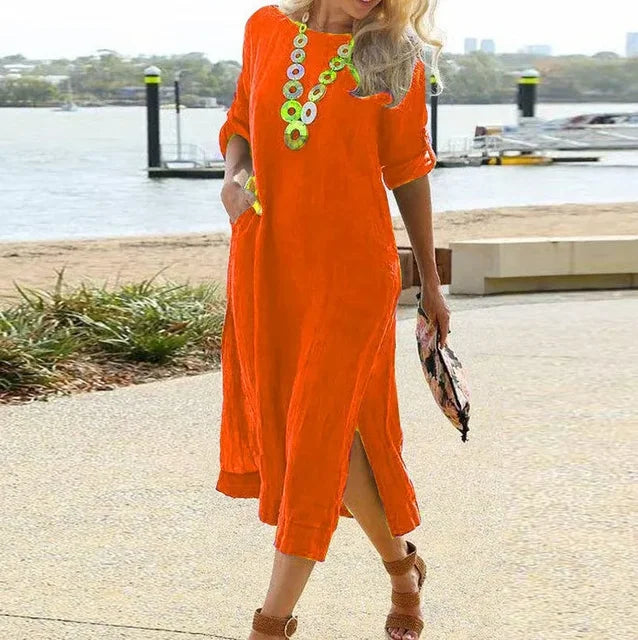 Eleganter Tragekomfort durch das weiche, fließende Material, das sich angenehm auf der Haut anfühlt. Die praktischen Seitenschlitze und die lockere Passform verleihen dem Kleid eine besondere Note und sorgen für maximale Bewegungsfreiheit.