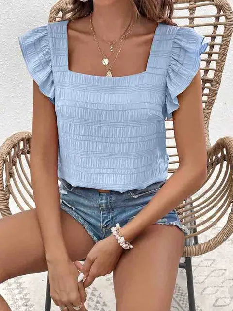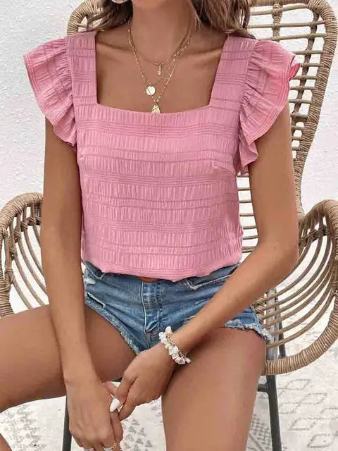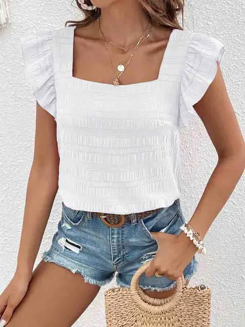 Eleganz und Leichtigkeit. Der quadratische Ausschnitt und die hübschen Rüschenärmel verleihen diesem Top eine feminine Note, die Ihren Look auf ein neues Level hebt. Die geraffte Struktur sorgt für eine schmeichelhafte Passform, die Sie mühelos durch den Tag begleitet.