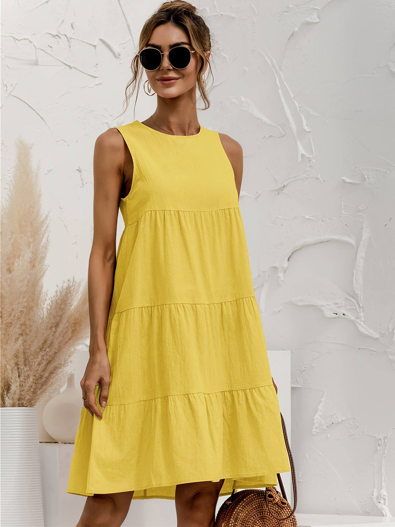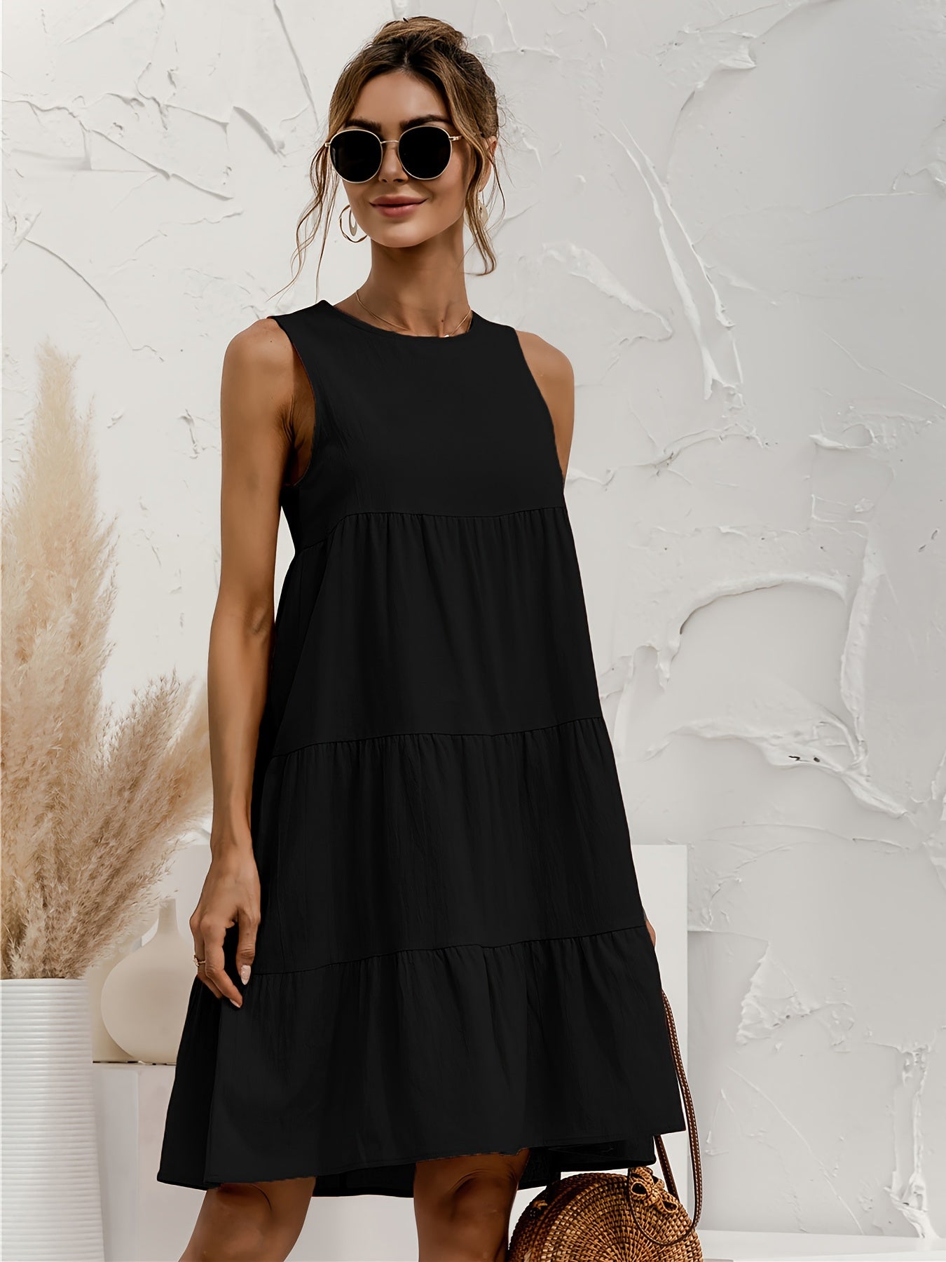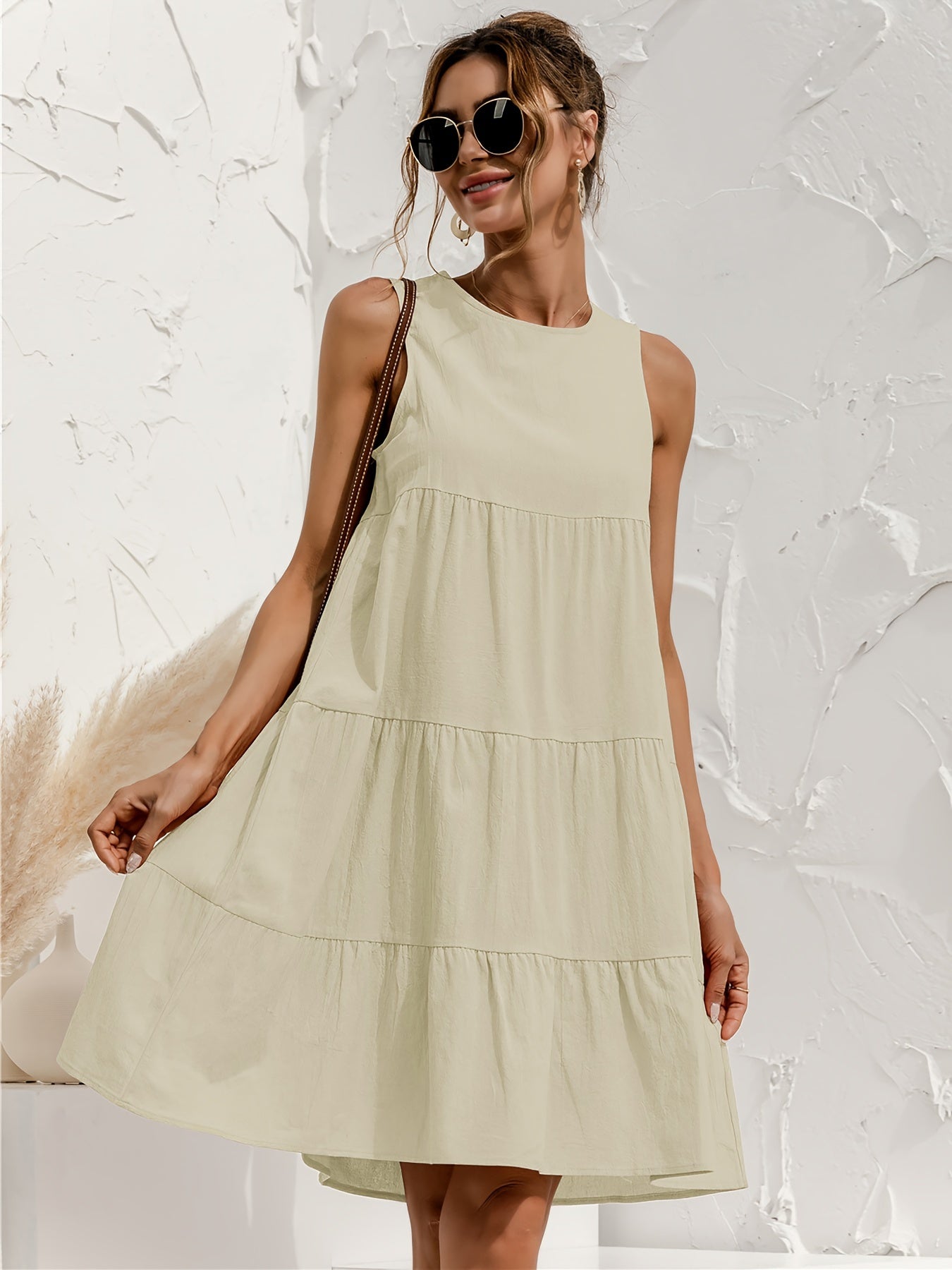 Minimalistisches Design: Die Stufen und der ärmellose Schnitt verleihen dem Kleid eine schlichte, aber elegante Note. Der lockere, fließende Stoff sorgt für ein angenehmes Tragegefühl und Bewegungsfreiheit.
