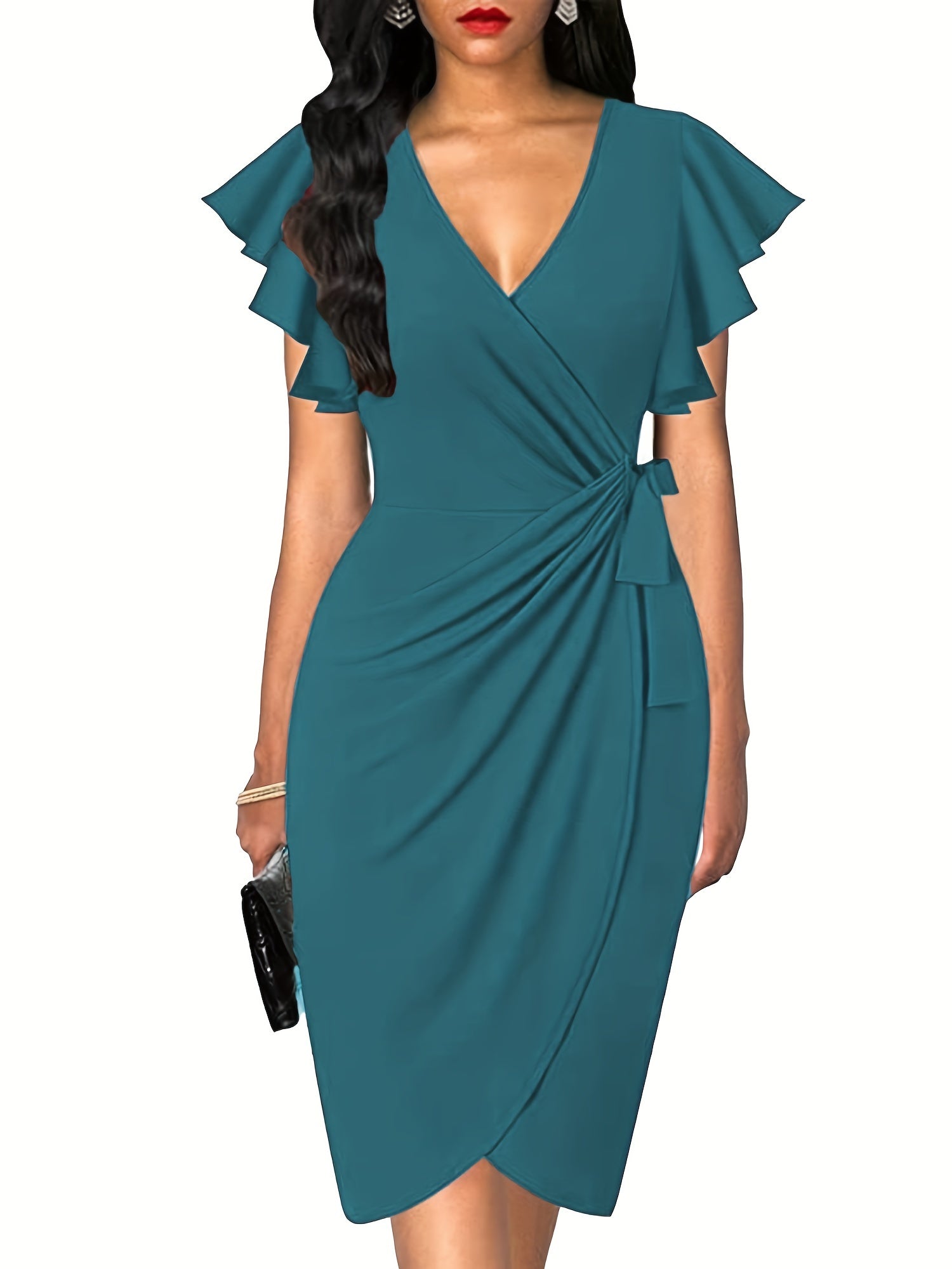 Wickeldesign mit Rüschenärmeln: Der weiche Stoff sorgt für ein luxuriöses Tragegefühl und verleiht dem Kleid eine elegante und feminine Ausstrahlung. Der taillierte Schnitt und das Wickeldesign bieten eine bequeme Passform, während die Rüschenärmel für einen romantischen und modernen Look sorgen.