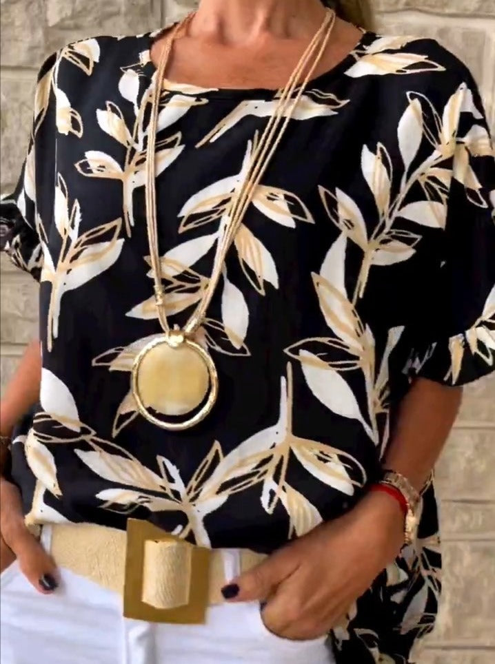 Ein Traum in Schwarz- Die feinen, goldenen Akzente setzen stilvolle Highlights, die das schlichte Schwarz perfekt ergänzen. Die lockere Passform und die sanft umspielenden Ärmel bieten eine perfekte Kombination aus Mode und Komfort. Ideal für die Frau, die sich Schönheit und Bequemlichkeit zugleich wünscht.
