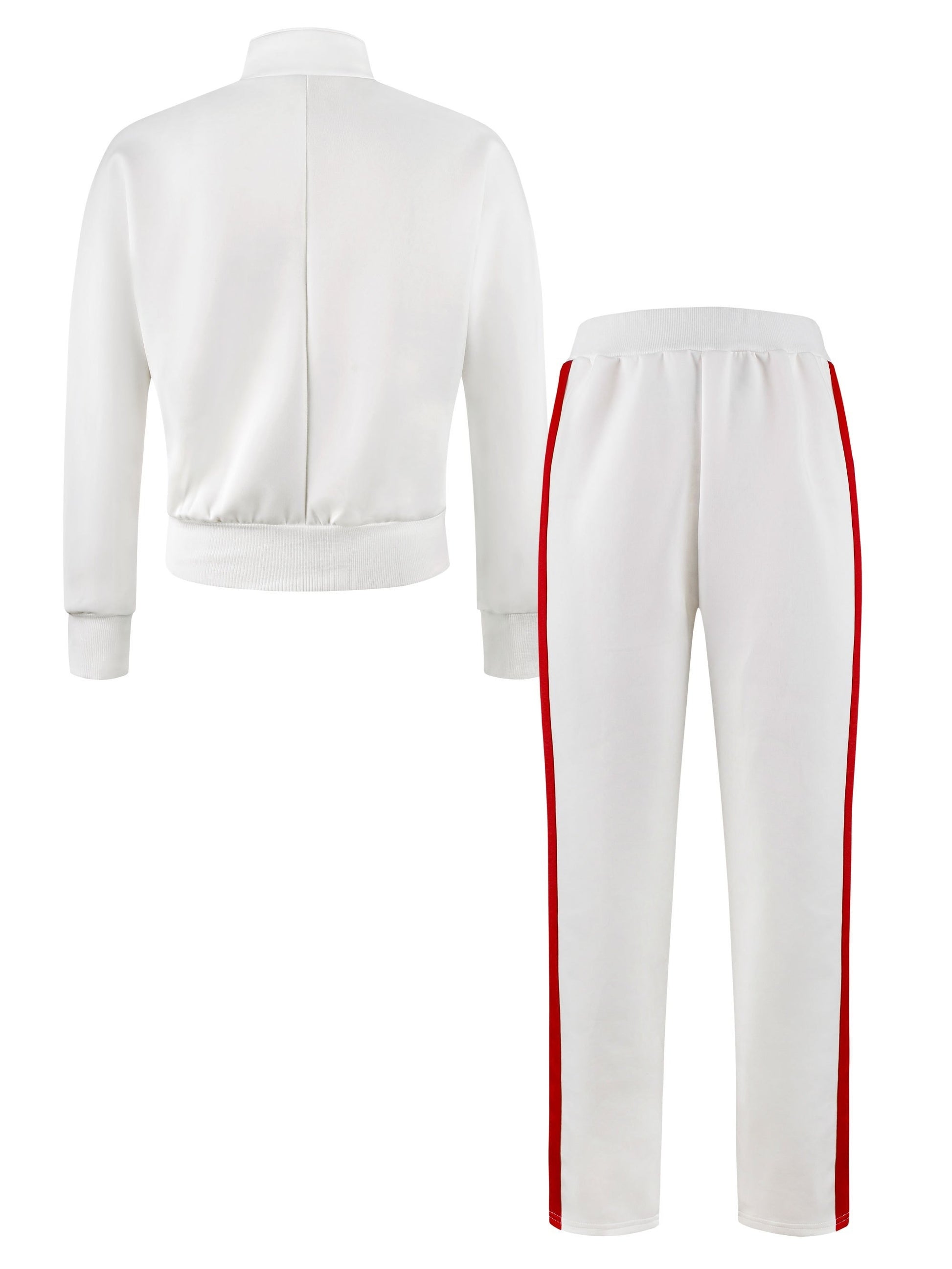 Der zweiteilige Trainingsanzug kombiniert stilvolle Eleganz mit sportlicher Funktionalität. Die Kombination aus Weiß und markanten roten Streifen sorgt für einen auffälligen Kontrast, der jedem Look eine dynamische Note verleiht. Die Jacke mit Reißverschluss bietet nicht nur einen modernen Look, sondern auch Flexibilität und Komfort für jede Art von Aktivität.