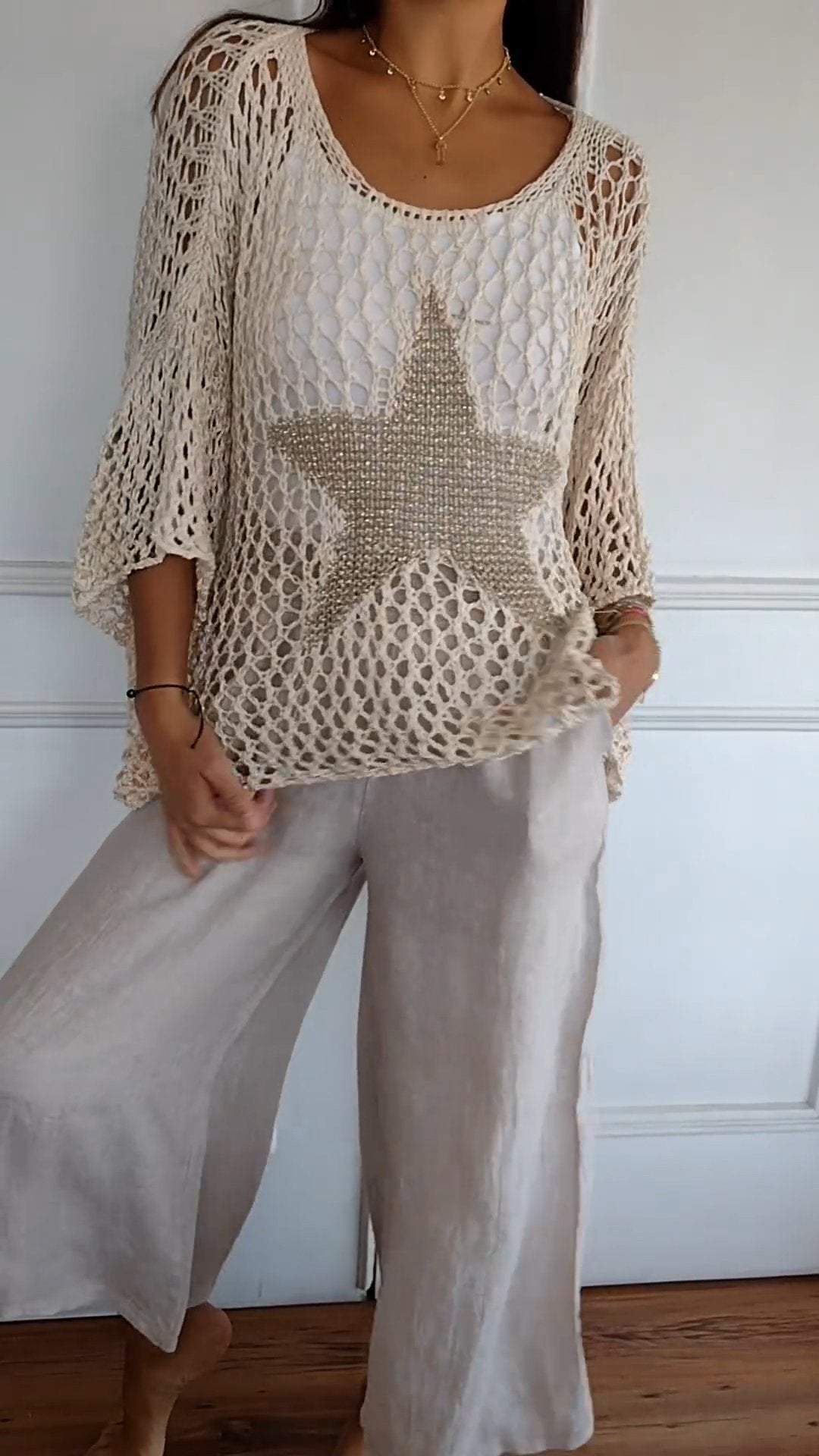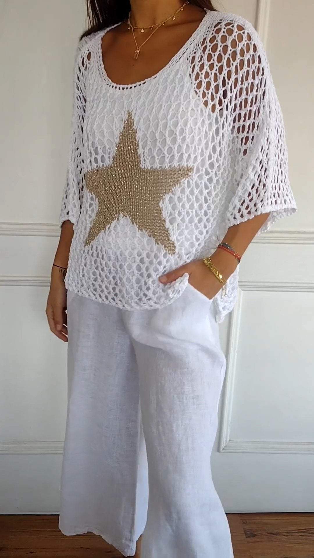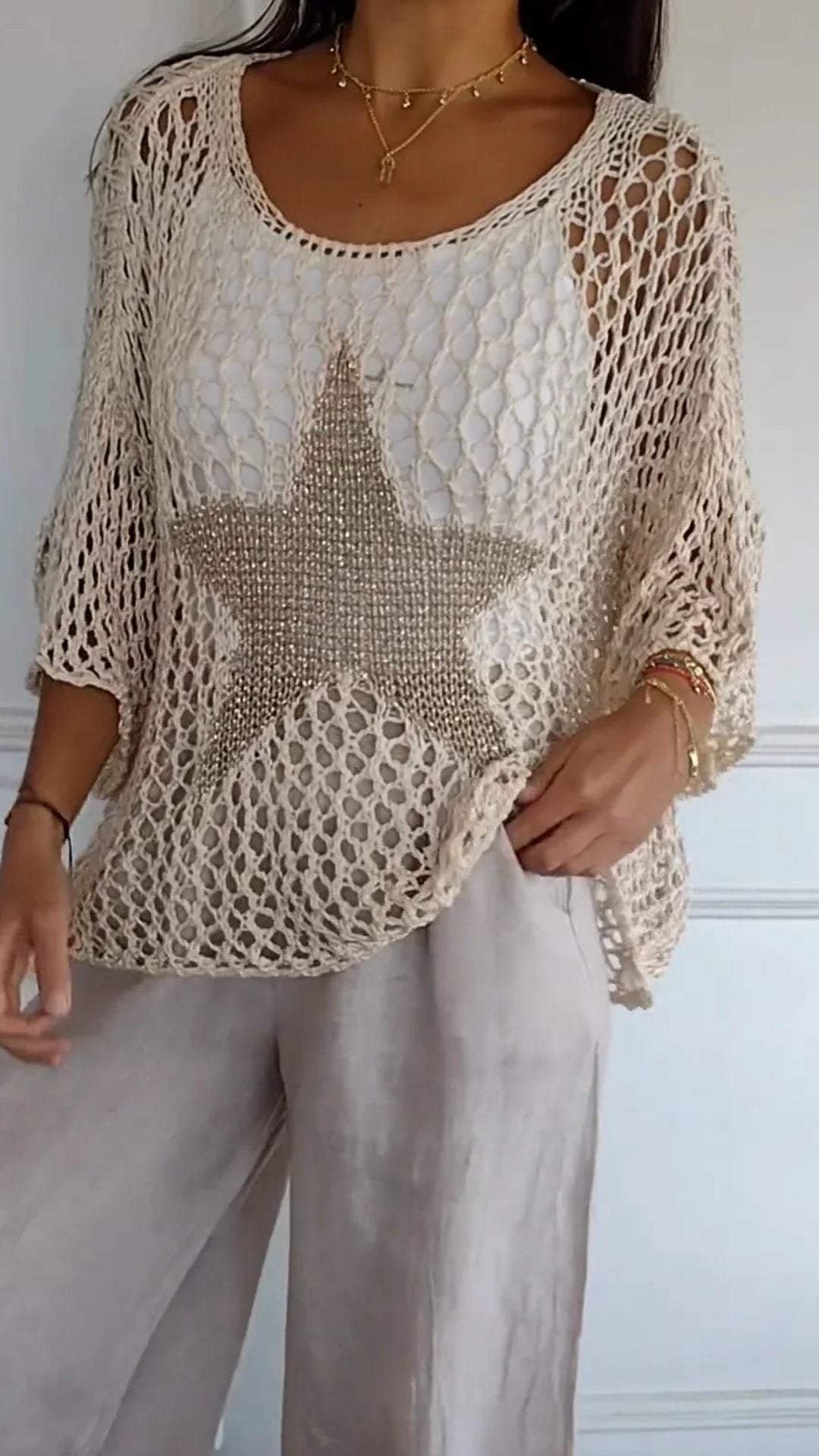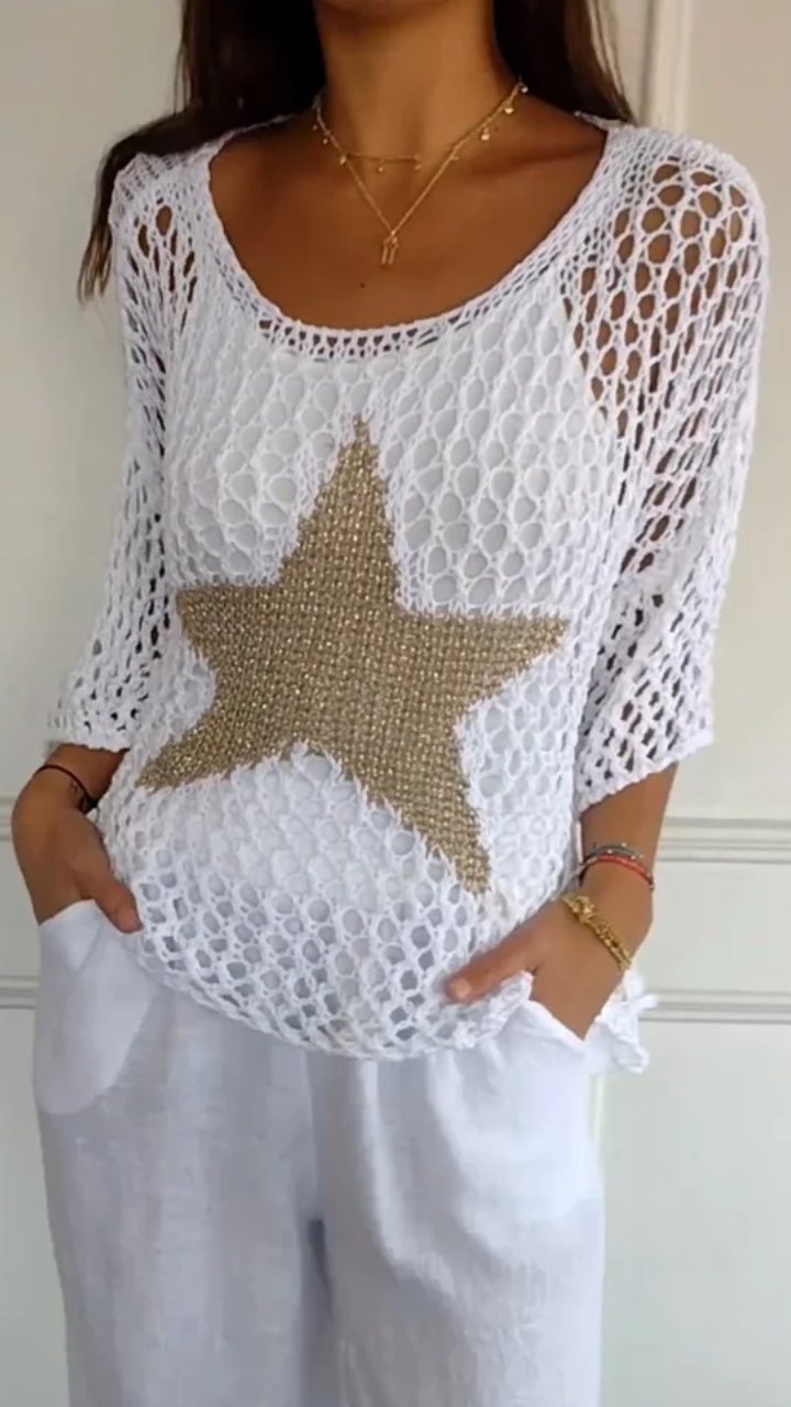 Leicht und Luftig- Häkelarbeit ist der Inbegriff des Sommers und dieses Top mit seinem großen, goldfarbenen Stern setzt ein modisches Highlight. Es ist perfekt, um an heißen Tagen kühl zu bleiben und dabei stilvoll auszusehen.