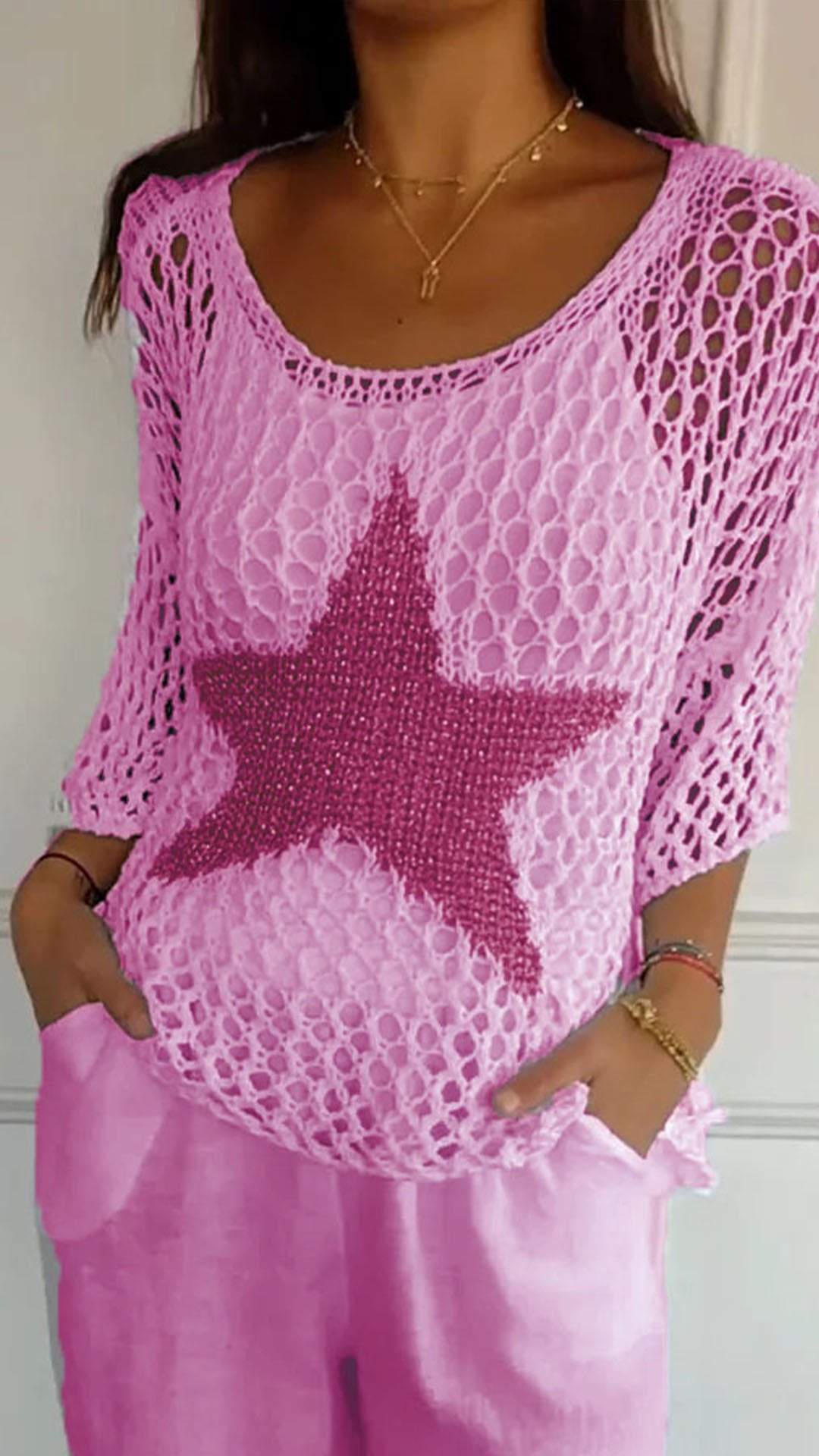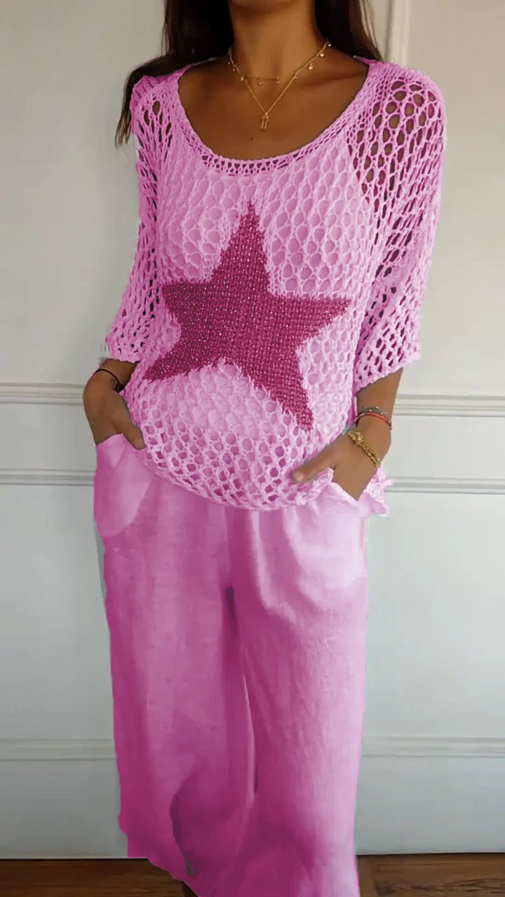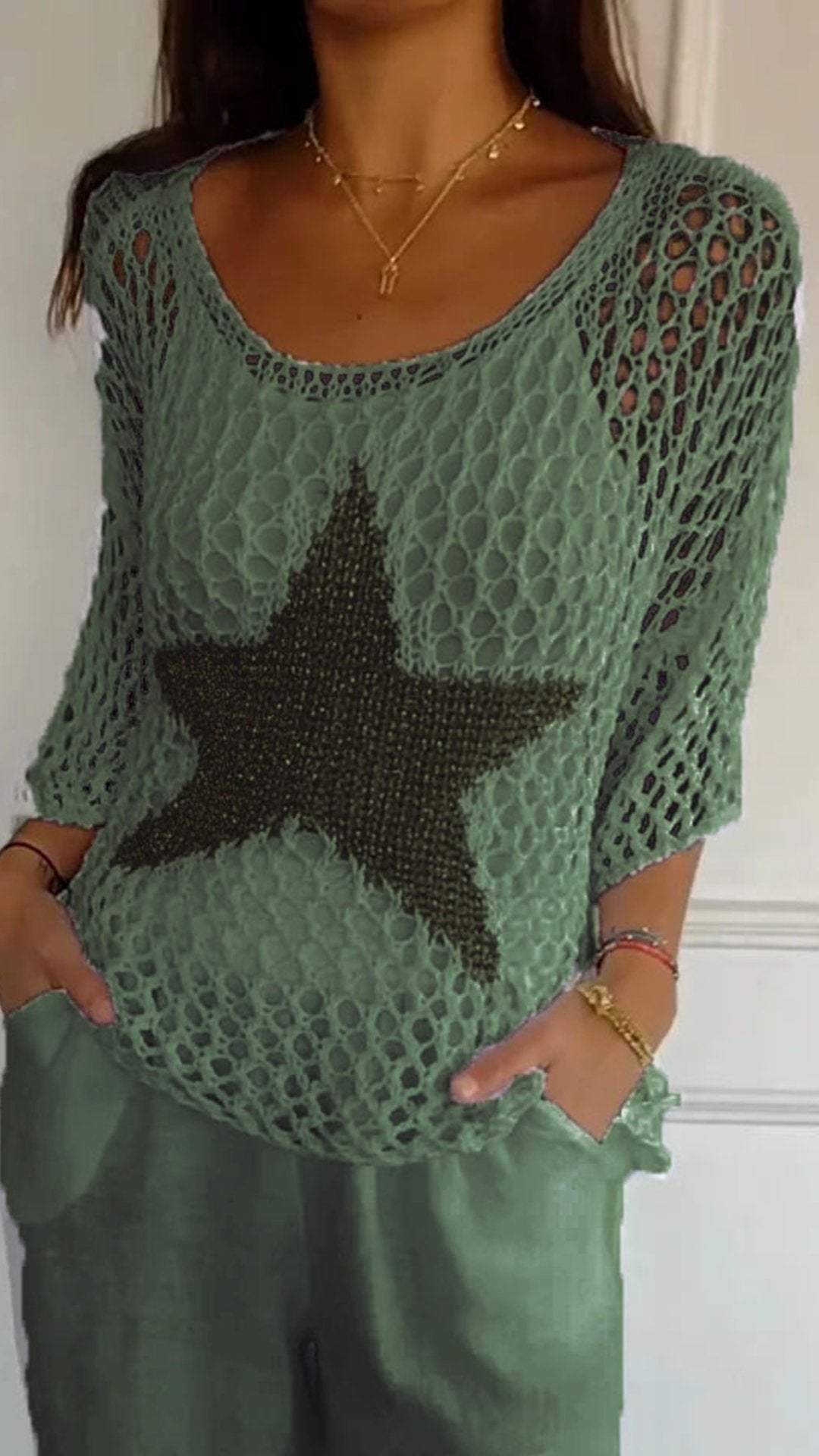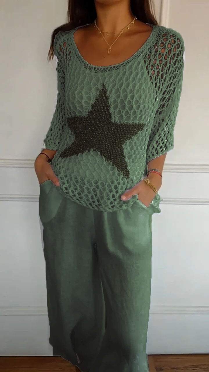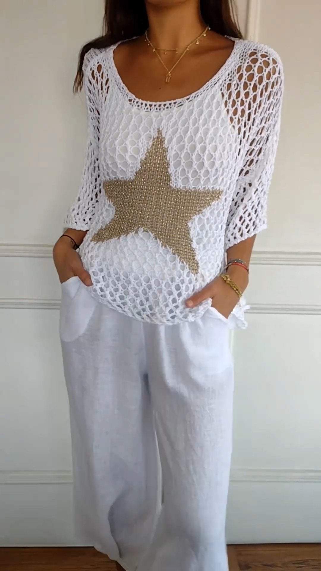 Leicht und Luftig- Häkelarbeit ist der Inbegriff des Sommers und dieses Top mit seinem großen, goldfarbenen Stern setzt ein modisches Highlight. Es ist perfekt, um an heißen Tagen kühl zu bleiben und dabei stilvoll auszusehen.