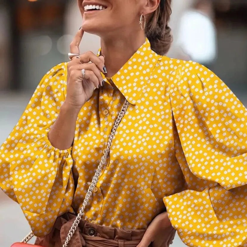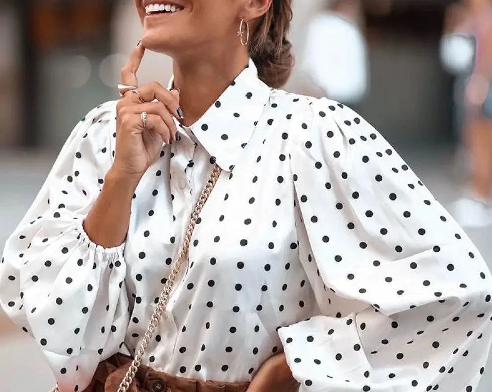 Einzigartige Designmerkmale und Komfort vereint. Die Bluse besticht durch ihre auffälligen schwarzen Punkte und die voluminösen Ärmel, die nicht nur modisch aussehen, sondern auch für eine angenehme Passform sorgen. Das weiche, atmungsaktive Material bietet den ganzen Tag über Komfort und Stil.