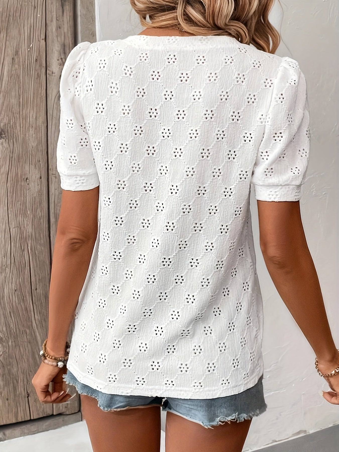 Elegant und luftig für deinen Sommerlook. Die leichte Baumwollmischung und das durchbrochene Muster sorgen für Atmungsaktivität und Komfort an warmen Tagen. Die zarte Textur und das makellose Weiß unterstreichen deine feminine Ausstrahlung.