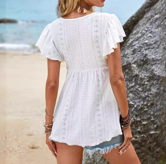 Erfrischen Sie Ihren Stil mit unserer Weißen Spitzenbluse. Dieses feminine Oberteil vereint Eleganz und Leichtigkeit, perfekt für warme Sommertage.