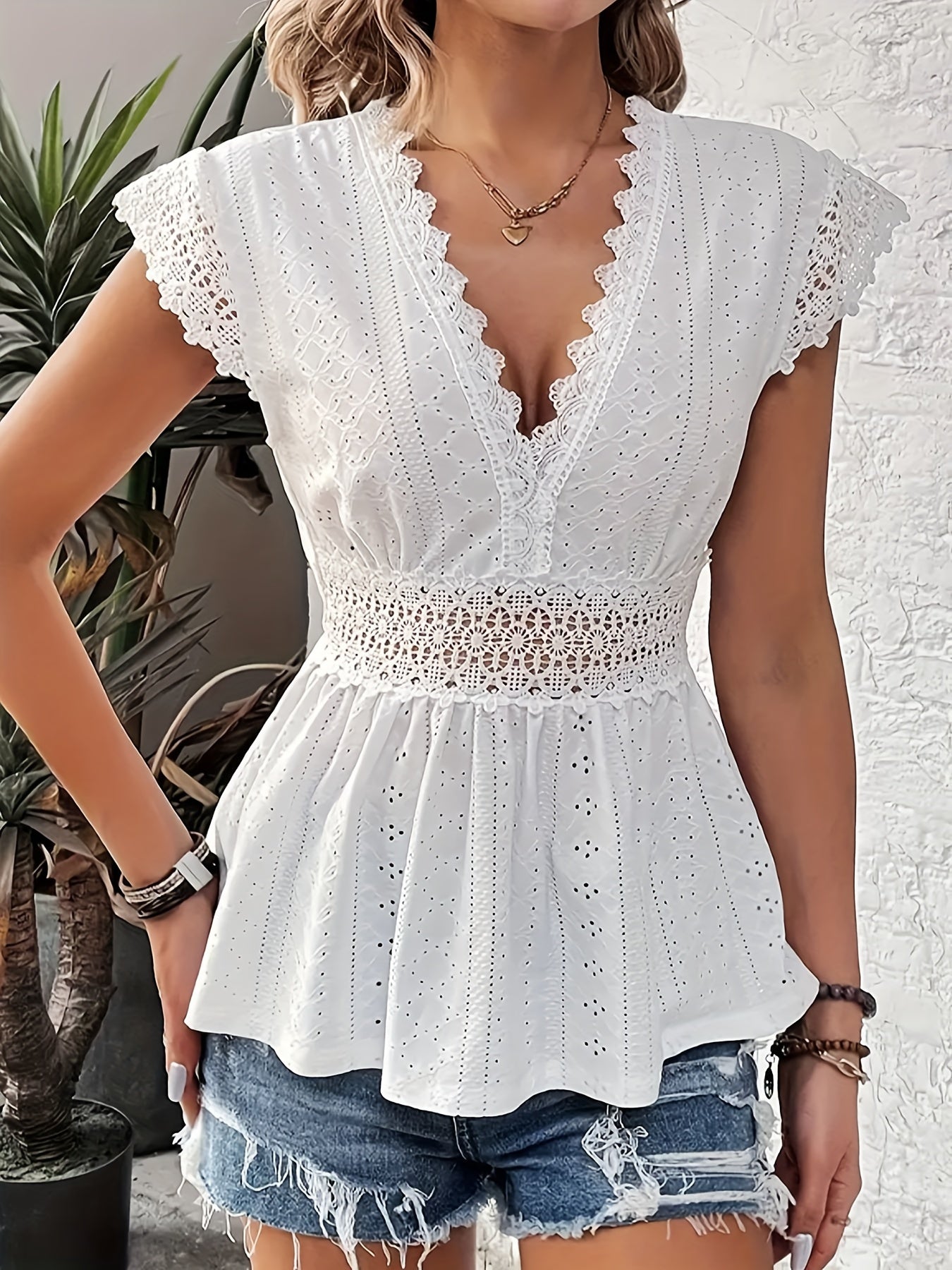 Erweitern Sie Ihre Sommergarderobe mit unserer Weißen Spitzenbluse. Dieses elegante Oberteil vereint romantische Details und luftig-leichtes Design, perfekt für warme Tage.