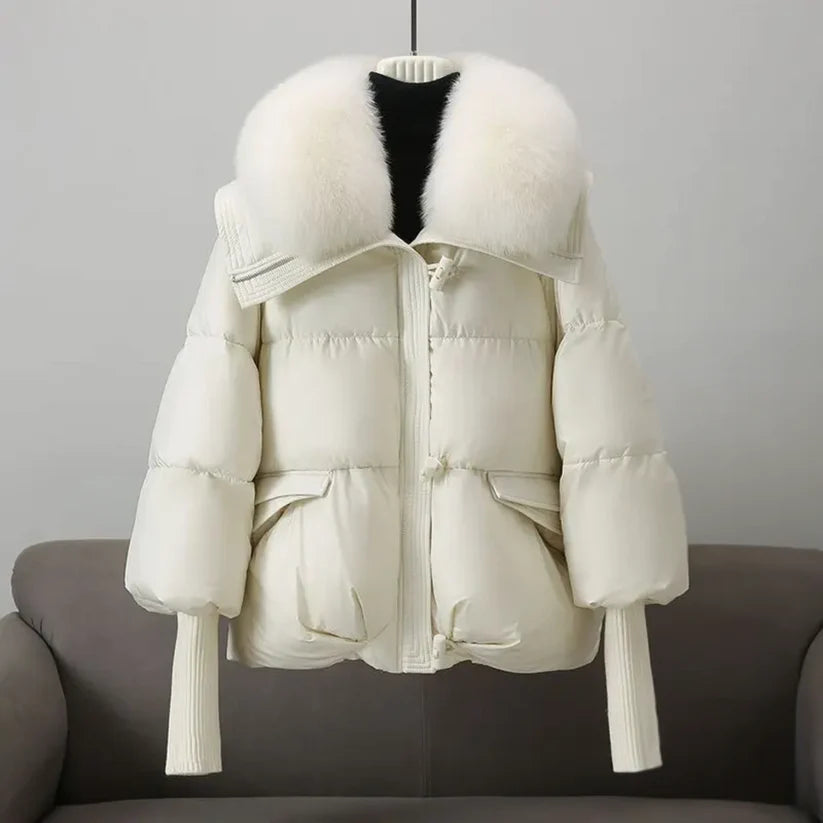 Erleben Sie ultimativen Schutz vor Kälte mit unserem weißen Daunenmantel, der Stil und Funktionalität perfekt vereint. Das luxuriöse Design mit einem kuscheligen Fellkragen sorgt dafür, dass Sie an frostigen Tagen stilvoll und warm eingepackt sind.