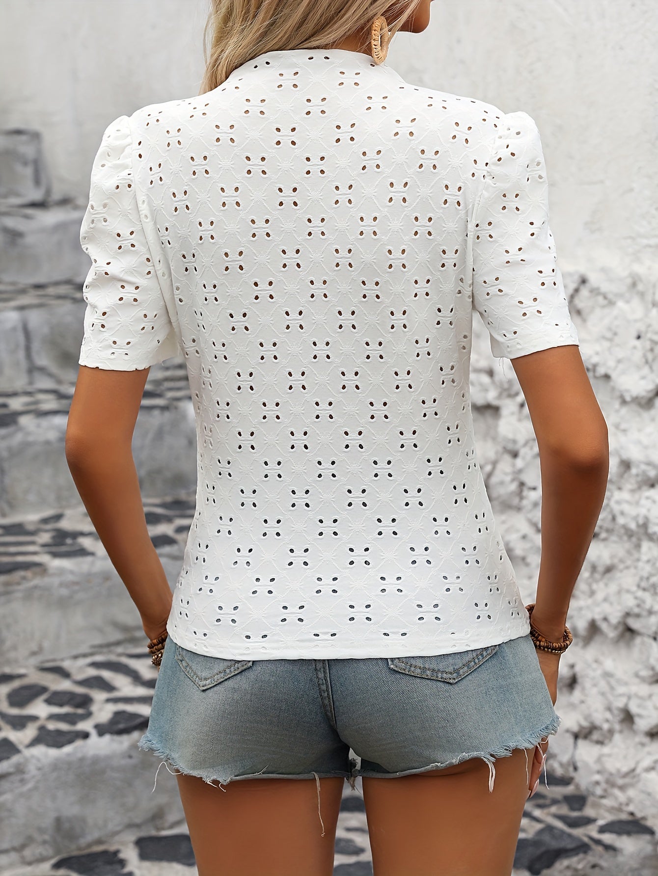 Entdecken Sie Ihren Stil neu mit unserer weißen Punkte-Bluse, die schlichte Eleganz mit modernem Flair verbindet. Diese Bluse ist ein Must-have für jede Garderobe, das Stil und Vielseitigkeit auf perfekte Weise kombiniert.